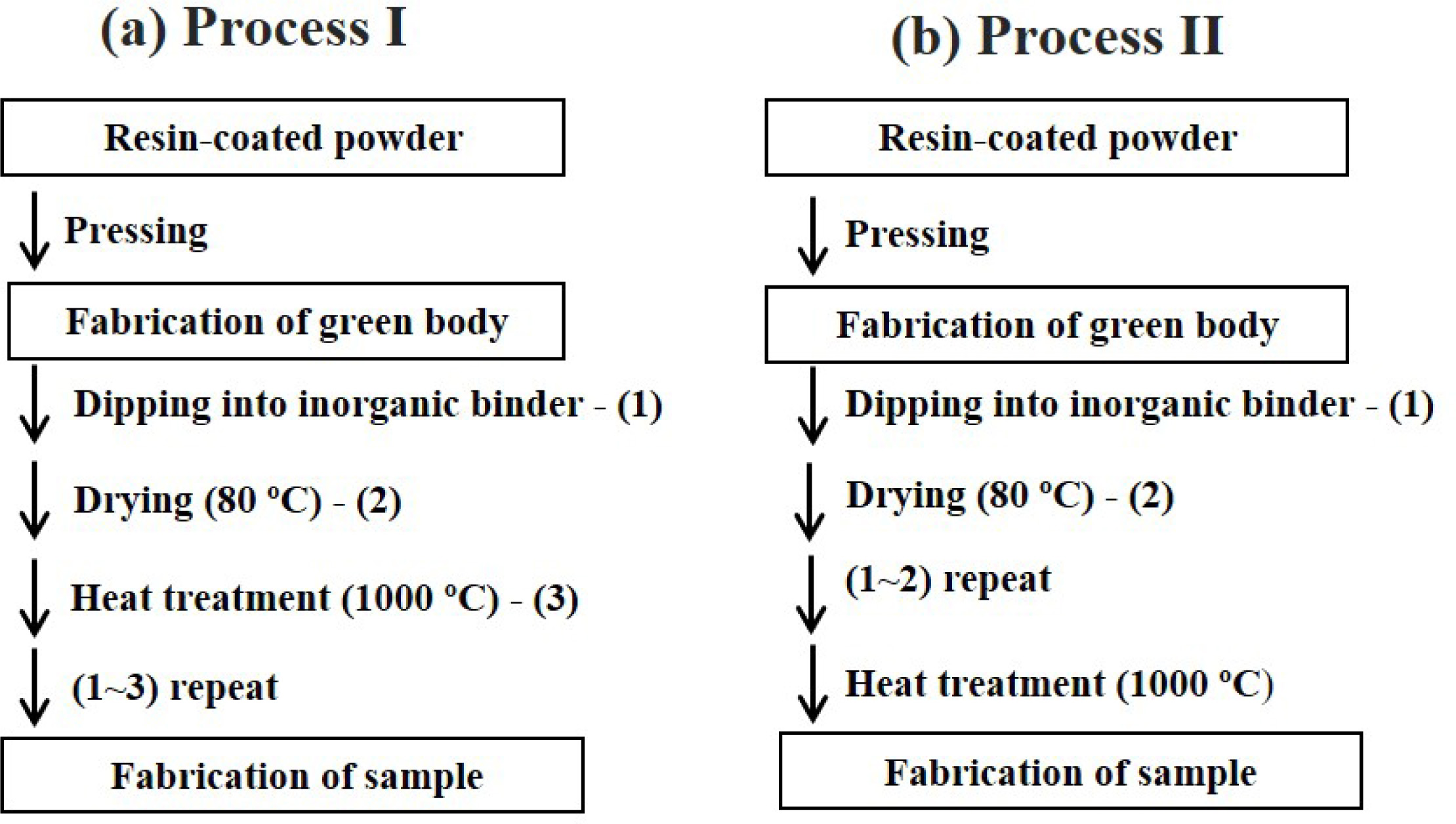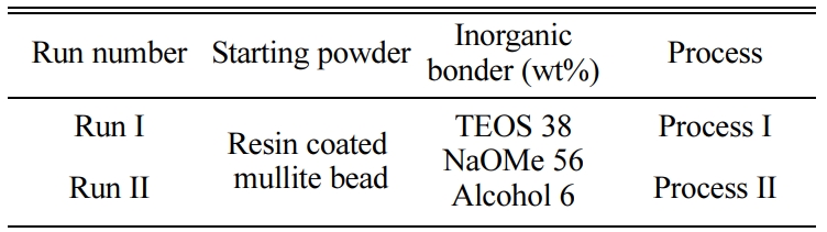 The inorganic binder system was composed of tetraethyl orthosilicate (TEOS; Sigma-Aldrich Korea) as a silicon dioxide (SiO2) precursor and sodium methoxide (NaOMe; Sigma-Aldrich Korea) as a sodium oxide (Na2O) precursor [6-8]. Basic formulations and experi- mental ranges for preparing the mold and core through the organic-inorganic conversion process are shown in Table 1. To improve the heat resistance and strength of the mold and core, a bead powder (Cerabead; Itochu, Osaka, Japan) having a particle size of less than 250 mm consisting of mullite (3Al2O3∙2SiO2) was used as a starting powder, which was coated with an organic binder using the resin-coated sand process. The green bodies of the bar (10 mm x 10 mm x 50 mm) and actual shape (mold and core) were prepared through a compression moulding process, and then dipped into the inorganic binder system at room temperature. The dipped samples were dried at 80 oC for a period of 1 h, and then heat-treated at 1,000 oC with a dwell time of 1 h in the atmosphere [9-11]. In process I, the impregnation into the inorganic binder, the drying process, and the heat treatment were continuously performed two times after the formation of the green bodies. In process II, the impregnation into the inorganic binder and the drying process were performed three times and the heat treatment was performed only once. A schematic diagram for fabricating the samples is shown in Fig. 1.