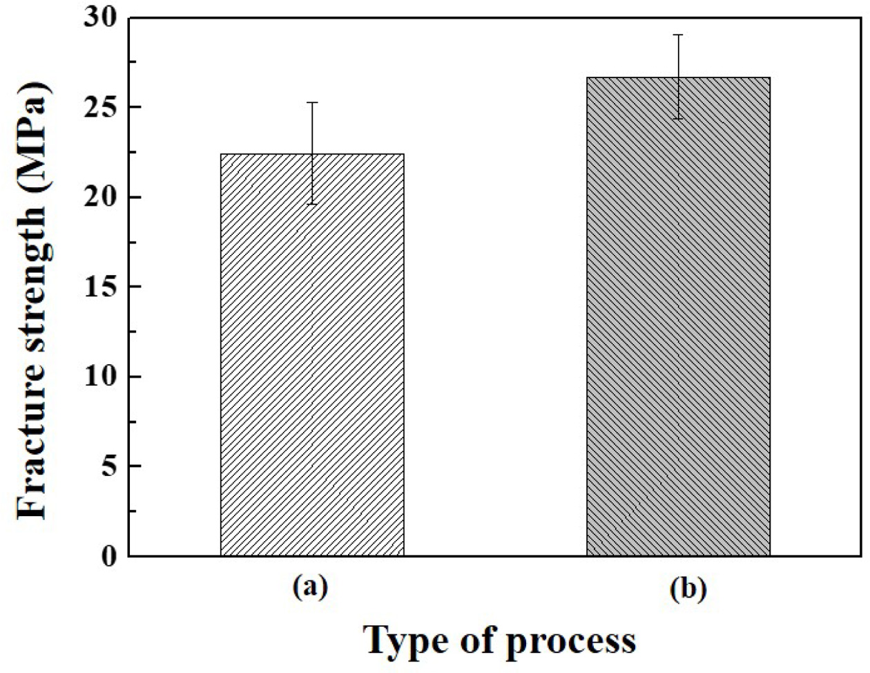 Fig. 2 Fracture strength of samples prepared with the inorganic binder after heat treatment : (a) process I and (b) process II. |