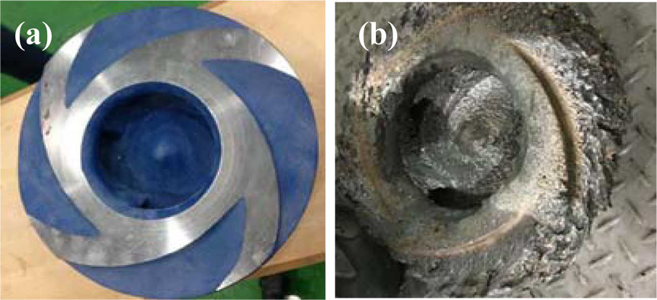Fig. 3 Gypsum bleed pump impeller used in power generation: (a) new impeller and (b) used impeller. |