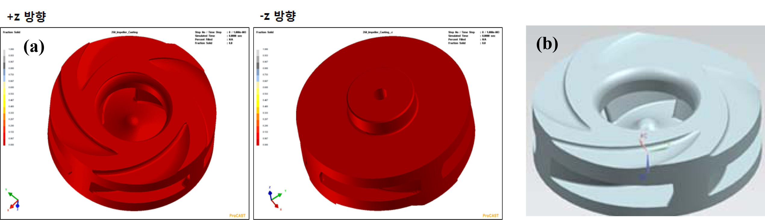 A solidification analysis was carried out to design the mold and core in the form of a real shape. The coagulation analysis method was carried out by the “Pro-Cast” program. As shown in Fig. 4(a), when the gravity direction was set in both directions of the Z axis in the coagulation behavior, the behavior was almost identical in both directions. Depending on the results in Fig. 4(a), the 3D model of the gypsum bleed pump impeller was designed (Fig. 4(b)),