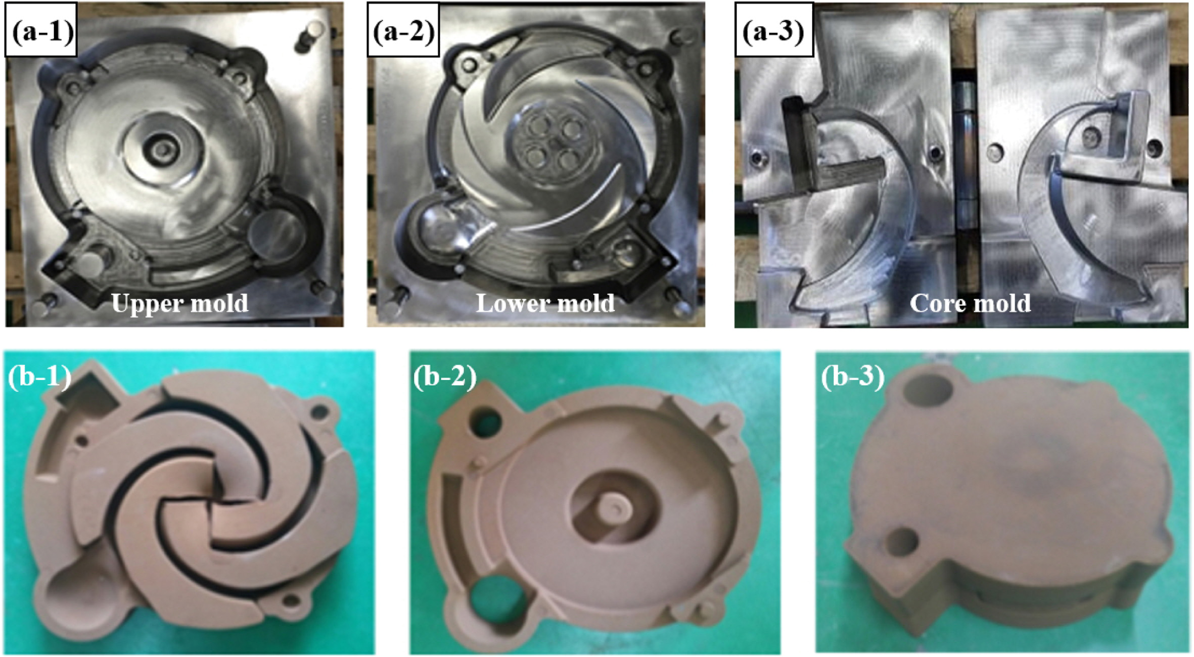 Fig. 5 Mold and core prepared by metal molds for 250 mm impeller: (a) metal molds and (b) mold and core. Each number in (a) indicates the upper mold, lower mold, and core mold, respectively. Each number in (b) indicates the lower mold combined with core, upper mold, and sealed mold, respectively |