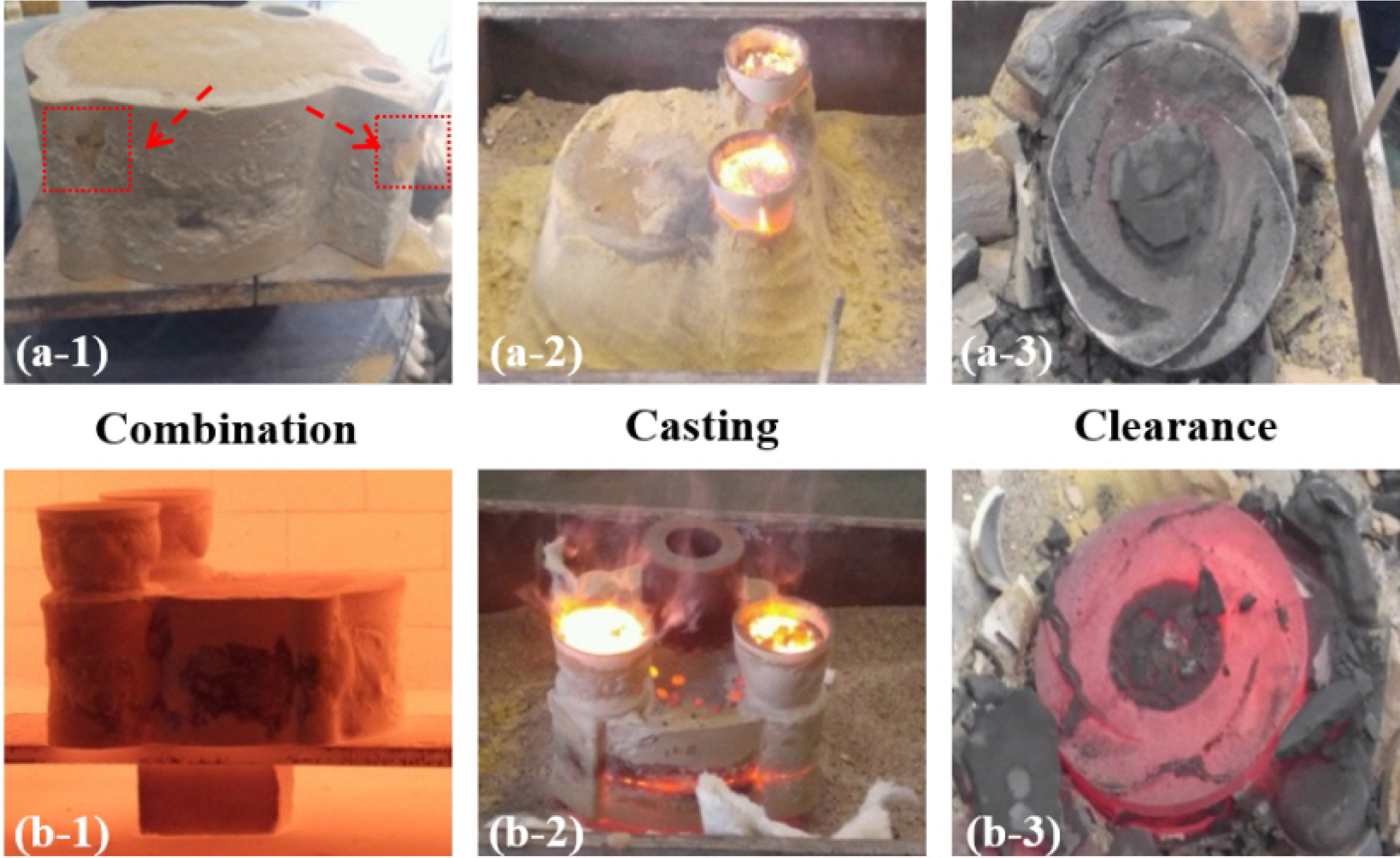 Fig. 6 Casting process of 250 mm impeller: (a) normal temperature of 250 oC and (b) high temperature of 750 oC. Each number indicates the mold and core, casting process, and products after the clearing process. |