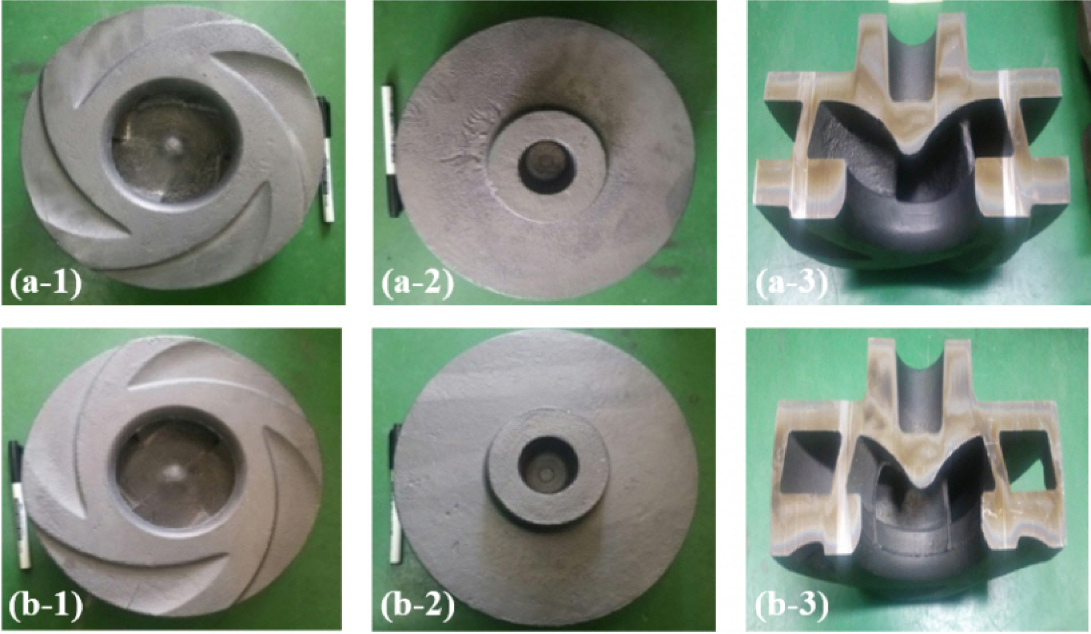 The metal molds for making a real mold was produced by giving a margin for the processing part and casting margin to 20/1000 (Figs. 5(a-1) and 5(a-2)). In addition, the core mold for forming the air flow path in the impeller is shown in Fig. 5(a-3). Because the sand-casting does not use the shell mold method, unlike precision-casting, the molds are made by combining the upper mold for the pouring in of the molten metal and the lower mold for the shape formation of the casting product. The allowable error in the metal mold was given a dimension of ±0.05 mm. The mold and core applied the inorganic binder for casting the 250 mm impeller are presented in Fig. 5(b), showing no crack and shape change even after the heat treatment at 1,000 oC.
