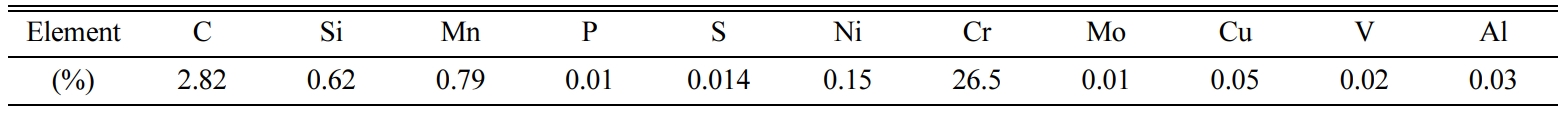The fracture strengths of the bar samples after heat treatment were measured using a universal testing machine (Instron 5566; Instron Corp., Norwood, MA) in the bending mode at a rate of 0.5 mm×min–1. Tests were carried out at room temperature, and five runs were performed to determine the standard deviation of the fracture strength. First, the abrasion resistance test of the cast impeller was carried out according to the test standard ASTM G75 (test instrument and specimen size). The slurry was mixed with 150 g AFS 50/70 test sand and 100 ml water. The running condition was a horizontal reciprocating motion for 2 h at 48 rpm. The corrosion test was performed in accordance with ASTM A262, and the exposure time in the corrosion test solution was 30 min. The composition of the test solution was 236 mL sulfuric acid (95%), 400 mL water, and 25 g ferrous sulfate heptahydrate. The corrosion resistance was expressed as the ratio of the weight of the sample before and after the test. The thickness of the casting product was measured by using an ultrasonic thickness gauge. External and internal defect inspection of the fabricated impeller was carried out by magnetic particle test (MT) and radiographic test (RT).
