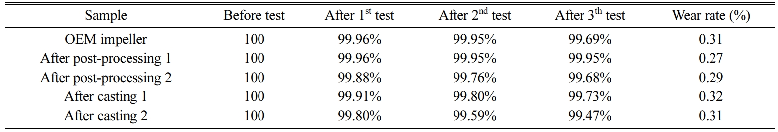 The results of the abrasion resistance test for the 250 mm impeller are shown in Table 3. In the case of a postprocessed impeller, because the hardness value differs from that of the cast impeller due to the heat treatment (annealing and hardening heat treatments), two samples were prepared for the cast and postprocessed products. In addition, the impellers were sampled from the outer surface of the blade, where wear is most severe during operation. As a result of the abrasion test, it was confirmed that the impeller fabricated in this study has good abrasion resistance, and the abrasion resistance of the postprocessing impeller is somewhat superior to that of the cast impeller. This is considered to be the result of the change of hardness by the annealing and hardening heat treatments. These values were also similar to those of the OEM (original equip- ment manufacturer) impeller. The results of the corrosion resistance test for the cast and postprocessing impellers are shown in Table 4, in comparison with that of the OEM impeller. The cast and postprocessing impellers showed excellent internal characteristics compared with the OEM impeller. These results suggest that the austenite structure with a high corrosion resistance is higher than for the OEM product [19, 20]. The impeller cast using the mold and core with the inorganic binder had improved corrosion resistance by 130% against the OEM impeller.