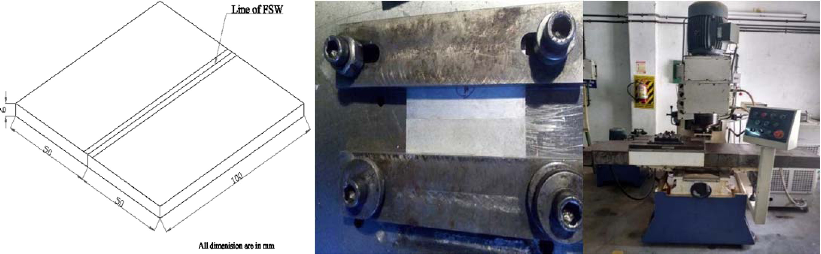 Trial welds were tried out to find the range of FSW process parameters that fetch good welding results. The parameters and their range were selected as: Tool rotation speed (TRS) 900-1100 rpm, Weld speed (WS) 30-50 mm/minute and Axial Force (AF) 8-12 kN. Butt joint configuration was selected to fabricate the FSW joints [26]. A non-consumable square tool, made of high carbon high chromium steel, was used to fabricate FSW joints in a vertical milling machine. The dimensions of the FSW tool are given in Fig. 1. Taguchi design is used to find the proper control factor settings. For the design of 3 parameters with each 3 levels, L27 orthogonal array is selected to carry out the experiments. The process parameters of FSW are shown in Table 2. The FSW machine and the weld specimen are shown in Fig. 2.