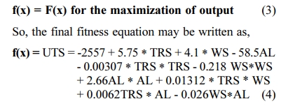 In GA, the fitness function is calculated for each string of chromosome in the population lot using the empirical relation. The fitness function is constructed from the empirical equation with the maximum R2 value as shown in Table 7. The fitness function taken for the genetic algorithm analysis was taken as follows: