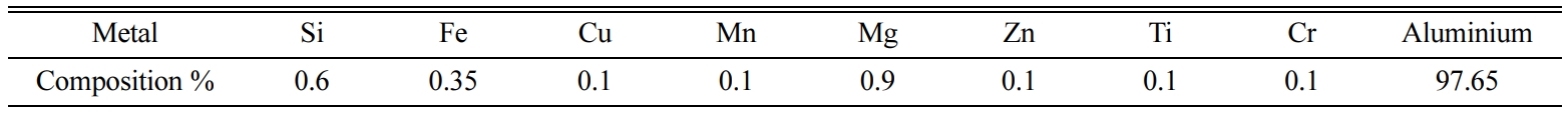 AA6063-SiC-B4C Hybrid Composite is manufactured by using stir casting technique, prior to the FSW process. The chemical composition of AA 6063 alloy are shown in Table 1. AA 6063 is one of the aluminium alloy with better properties in 6XXX alloys such as high fatigue strength and good corrosion resistance [25]. The alloy is being replaced by hybrid composite in the components of rib and wing structures in aircrafts. AA 6063 alloy was used as a matrix B4C with a size of 30 microns and silicon carbide with a size of 33 microns were used as a reinforcements. In stir casting technique, Aluminium billets placed in a graphite crucible were heated to temperature of around 730 oC. Meantime, the reinforcements SiC and B4C each 10% of weight were preheated to 900 oC in a muffle furnace for a soaking time of one hour to remove the moisture content. Mg powder of 1% of weight was added into the melt to improve the wettability factor of reinforcements. Preheated reinforcements were added with AA 6063 through a feeder and it was stirred well for 30 min. The dimension of 100 mm × 100 mm × 10 mm was which was preheated to around 300 oC to promote gradual heat dissipation from the melt.