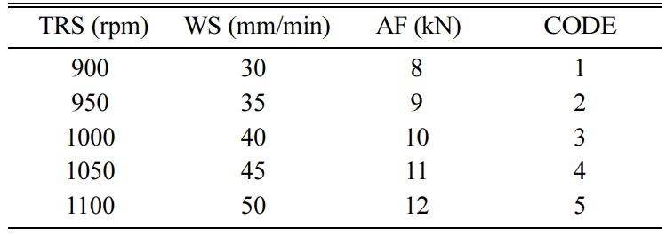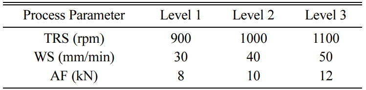 The implementation of the genetic algorithm is essential to define the solution string or chromosome for the optimization problem. The bits or genes in the chromosome may be taken as binary or real integer number. In this work, TRS, AF and WS were considered to be the process parameters for the FSW process. Each of these variables is represented in real integer format. The length of the string is 3 in which every bit is used for the representation of TRS, WS and AF in sequence. The strings (111) and (999) represent the lower and upper limits of the process parameters. The coding for the FSW parameters is given in Table 8.