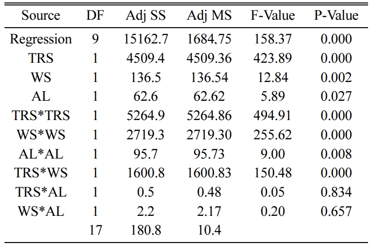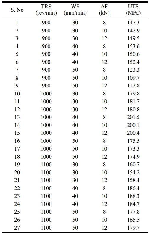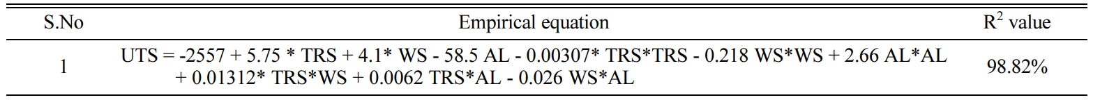 The adequacy of the experiments conducted is checked using ANOVA table using MINITAB V17 software shown in Table 4. ANOVA table shows the significance of each parameter involved in the process. The Probability value (or P-Value) for all parameters given shows values less than 4% or 0.05 thereby indicating that all three parameters of FSW are significantly influencing the TS value of the weld joint. TRS is the most significant parameter affecting the response followed by AF and WS. The R-Square and Adjusted R-Square values are greater than 90 % stating that strong relationship exists between the response and the predictor. The regression formula for the UTS is obtained and shown below:
