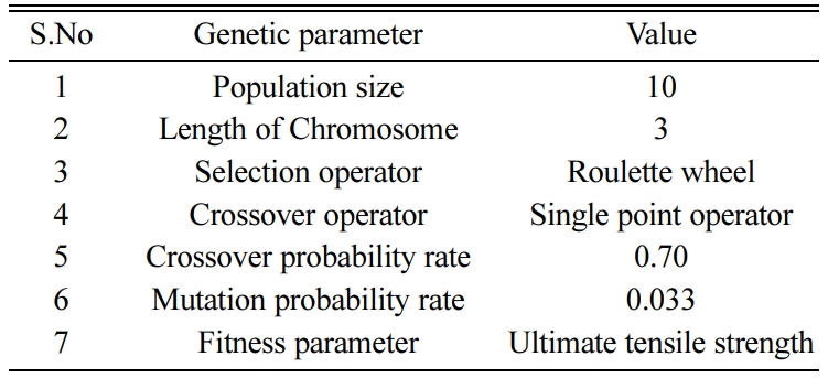 The population size, cross-over probability rate and Mutation probability rate are considered as shown in Table 10. Cross-over rate is selected to 0.70 to ensure that the better combination of parameters with good fitness value is retained to the next generation. In order to get the desired variability in the population, mutation rate is selected to 0.033 to change one bit in the population of 10.The levels are decoded accordingly as shown in Table 11.