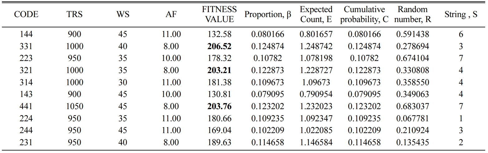 At the point of initialization, the solution space of a population lot is generated from the set of parameters mentioned above. The limit of the population lot is considered as 10 as shown in Table 10. Column 1 re- presents the string of the parameters. Columns 2, 3 and 4 represent the corresponding values of FSW process parameters. Column 5 shows the fitness value of the string derived from the empirical relation from Table 10. Columns 6, 7, 8, 9 and 10 represent the proportion (β), expected count (E), cumulative probability (C), random number (R) and string (S). The values for proportion (β) and Expected count (E) are tabulated from the following formulae: