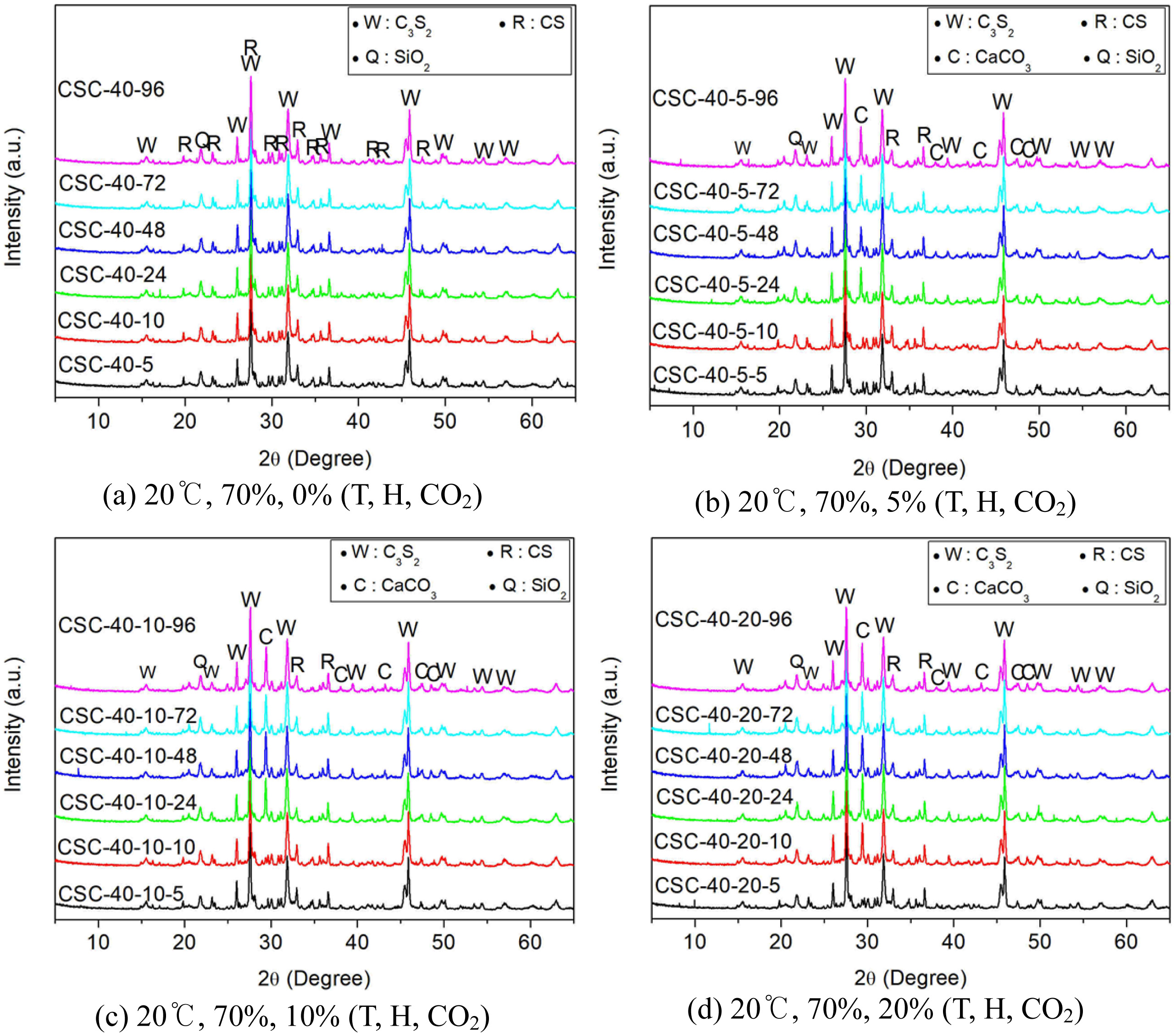 Fig. 3 XRD patterns of CSC paste with CO2 concentration. |