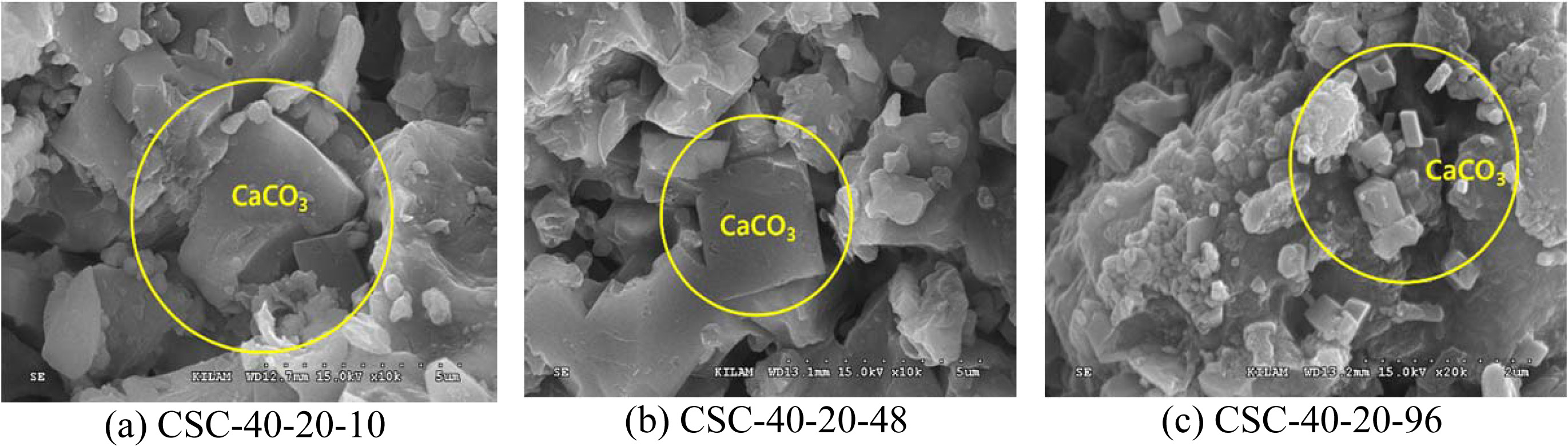 In an attempt to observe the crystalline growth of CaCO3, the samples cured at a CO2 concentration of 20% were examined with respect to the curing time using SEM, as shown in Fig. 5. It was found that the carbonation reaction proceeded somewhat faster in the samples cured at a CO2 concentration of 20% than in those cured at the other conditions. Even at the early stage of curing, i.e., 10 h, the formation of CaCO3 was identified. Similarly, SEM analysis results confirmed the crystallinity of CaCO3 at curing 10 hours. At the early stage of curing, the degree of crystallinity appeared to be low, but as the curing time increased, the crystallinity became more evident, and the cured microstructure became increasingly densified. This was a macroscopic confirmation of durability improvement achieved in the cured CSC body by the carbonation reaction.