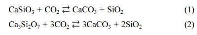 In theory, the main mineral phases of CSC include CS (CaO · SiO2, pseudowollastonite) and C3S2 (3CaO · 2SiO2, rankinite). However, depending on the raw material mixing ratios and sintering characteristics, other cement mineral phases, such as C2S and C3S, may be included, along with the remaining unreacted SiO2. Here, the mineral phases that react with CO2 are CS and C3S2, and compressive strength of up to over 70 MPa may be achieved through reactions represented by Eqs. (1) and Eq. (2) below [1-4].