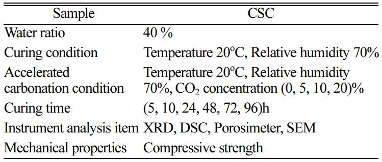 CSC paste was prepared to examine its ability to realize desired properties with respect to the curing conditions. Subsequently, it was subjected to carbonation curing while varying the CO2 concentration. The test conditions are summarized in Table 1. When preparing this CSC paste, the water ratio was set to 40%, which is the level that allows for the fabrication of samples in the form of a paste. Immediately after the mixing process, these samples were put on each reagent plate and spread widely with a thickness of about 100 mm and then subjected to curing in a carbonation chamber. This carbonation chamber operated at a temperature of 20oC and a humidity of 70%, and the CO2 concentration was set to 0, 5, 10, and 20%. At each curing time, samples were withdrawn from the chamber and pretreated, and their physical characteristics were examined using XRD, DSC, SEM, and porosity measurement.