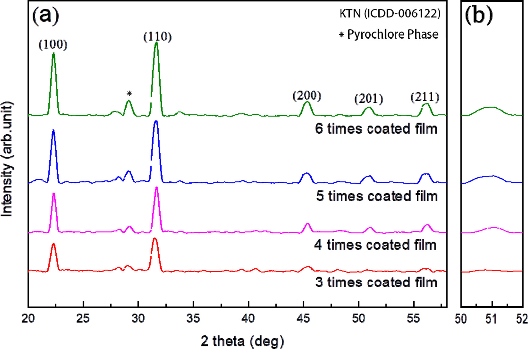 Fig. 1(a) shows X-ray diffraction (XRD) data of K(Ta0.60Nb0.40)O3/K(Ta0.40Nb0.60)O3 heterolayered thin films. A homogeneous KTN XRD patterns with a pyrochlore phase were shown in all specimens. As the coating number increased, the lattice constant of specimens decreased very slightly 3.983 Å to 3.976 Å. Also, the intensity of XRD peaks also increased. This crystallinity enhancement property is such that, as coating number increased, the underlying coating layer acts as a substrate, so that the crystallization of the upper layer is much better due to a decrease in the strain effect between the substrate and the thin films. In the graph 1(b) showing 50-52 degrees, a small peak is seen below 51 degrees in the 3 times coated KTN films, while a peak can also be seen above 51 degrees in the 4 times coated films. But, in the case of the 5 times and 6 times coated KTN films, due to the underlying layers affecting the crystal growth to the upper layers, two intensities of the underlying layers appear to be gathered in the middle and coexist.