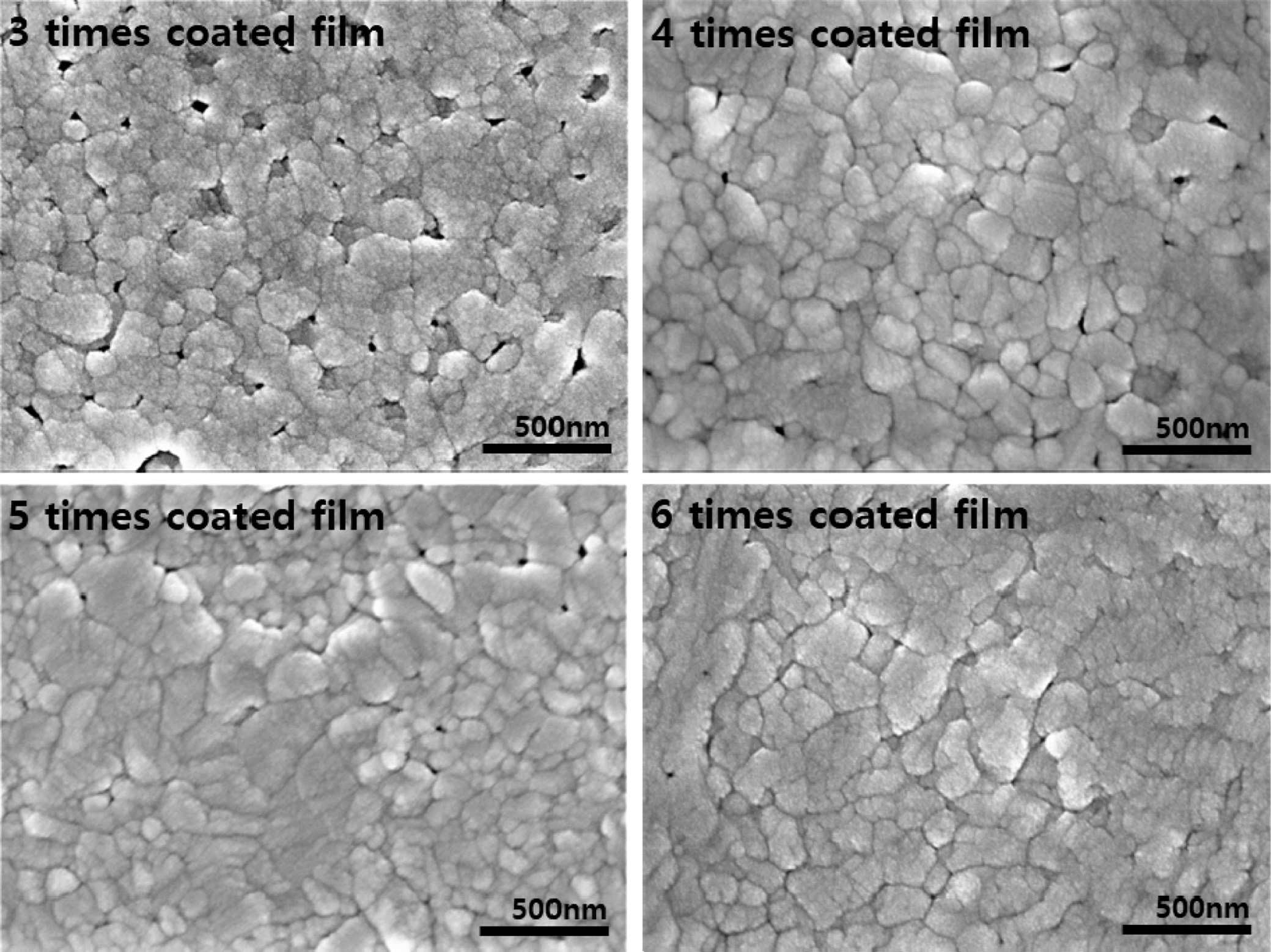 Fig. 2 shows the surface microstructure (SEM) of the K(Ta0.60Nb0.40)O3/K(Ta0.40Nb0.60)O3 heterolayered thin films. Pores gradually decreased as the coating number increased. As the coating number increases, the grain size increased. The surface image showed fine micro- structures with large and small grains mixed together.