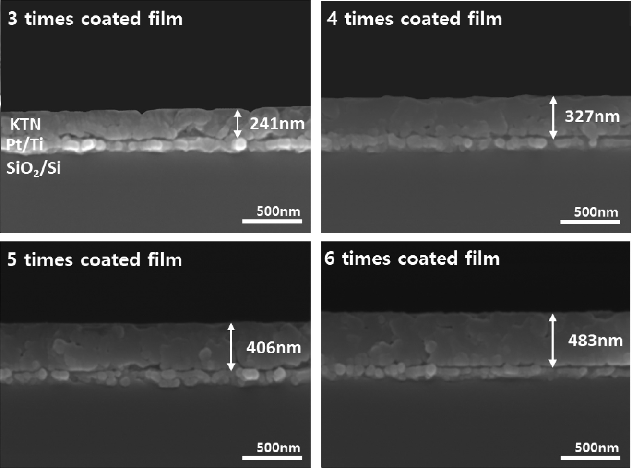 In this study, KOC2H5 (Sigma Aldrich, USA, 99%), Ta(OC2H5)5 (Alfa aesar, USA, 99.999%), and Nb(OC2H5)5 (Alfa aesar, USA, 99.999%) were used as the starting materials and 2-Methoxy Ethanol as the solvent. 2MOE (2-Methoxy Ethanol) was added to the KOC2H5 and stirred until the powder was completely dissolved. After, KOC2H5 was heated to 120 degrees in a N2 atmosphere, mixed with Ta(OC2H5)5, and heated again. Finally, Nb(OC2H5)5 was added and refluxed at 120 degrees for 24 h. The coating solutions were spin coated at 2,500 rpm for 30 sec on Pt(111)/Ti/SiO2/Si substrate. Each layer was dried at 200 oC for 20 min, and 400 oC for 20 min to remove the organic materials. The KTN films were annealing at 750 oC for 2 h. The crystal structures of thin films were confirmed by X-ray diffraction (XRD) measurement. The surface and cross section morphology were studied by the field-emission scanning electron microscope (FE-SEM). For electrical measurements, Pt-upper electrode with a diameter of 500 μm was deposited on the film by dc sputtering method. Dielectric properties and polarization hysteresis loops were analyzed using an LCR meter (PM-6036, Fluke) and ferroelectric test system (RT66B, NM, USA).