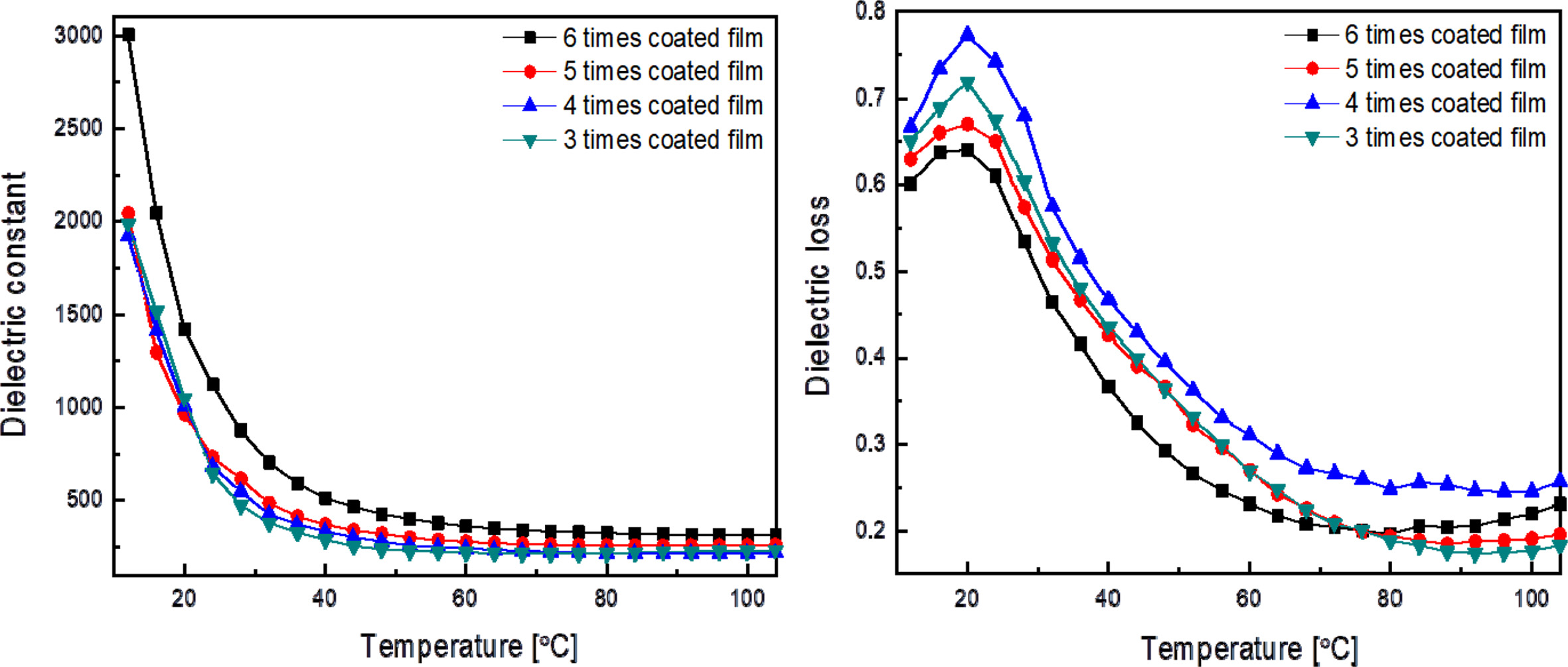 Fig. 4 shows the dielectric constant and dielectric loss of the K(Ta0.60Nb0.40)O3/K(Ta0.40Nb0.60)O3 heterolayered thin films according to temperature changes. The dielectric constant continuously decreased as the measured tem- perature increased 10 oC to 100 oC, which means the phase transition temperature was below the measurement temperature. As the coating number increased, dielectric constant gradually decreased and saturates at about 60 oC. Also, dielectric constant tended to decrease by decreasing the number of KTN film coatings [15]. The dielectric constant and loss at 6 coated KTN heterolayered thin films were 877 and 0.534 at 28 oC, respectively.