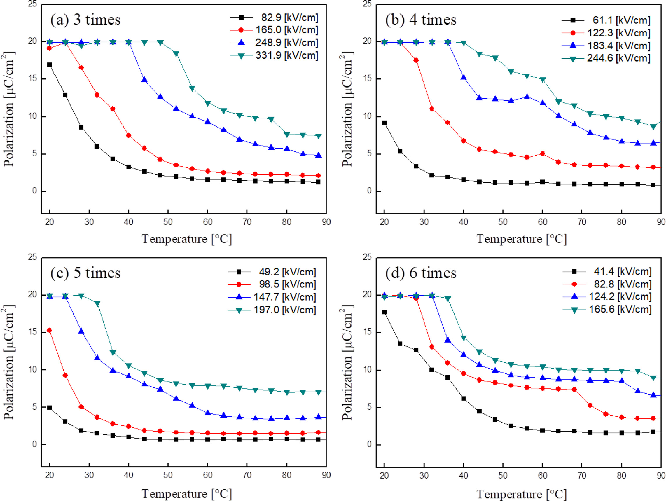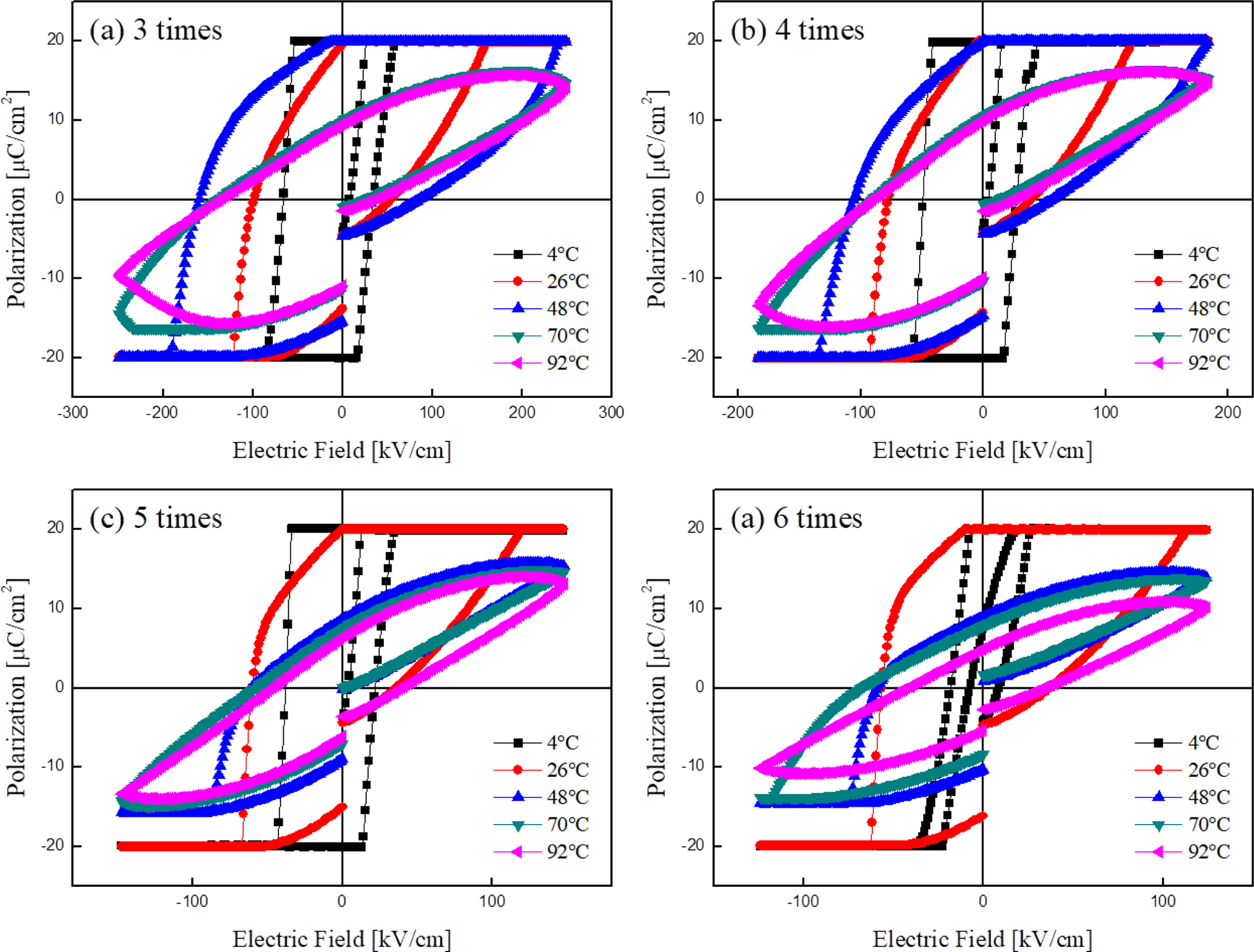 Fig. 6 shows the remanent polarization of the K(Ta0.60Nb0.40)O3/K(Ta0.40Nb0.60)O3 heterolayered thin films according to the number of KTN coatings and temperature. In this graph, there is a part in which the remanent polarization value rapidly decreases as this part is shifted to a low temperature, while the number of KTN coatings increases. As analyzed in Fig. 5, this can be seen that the domain switching suppression effect decreases as the number of KTN coatings increases.
