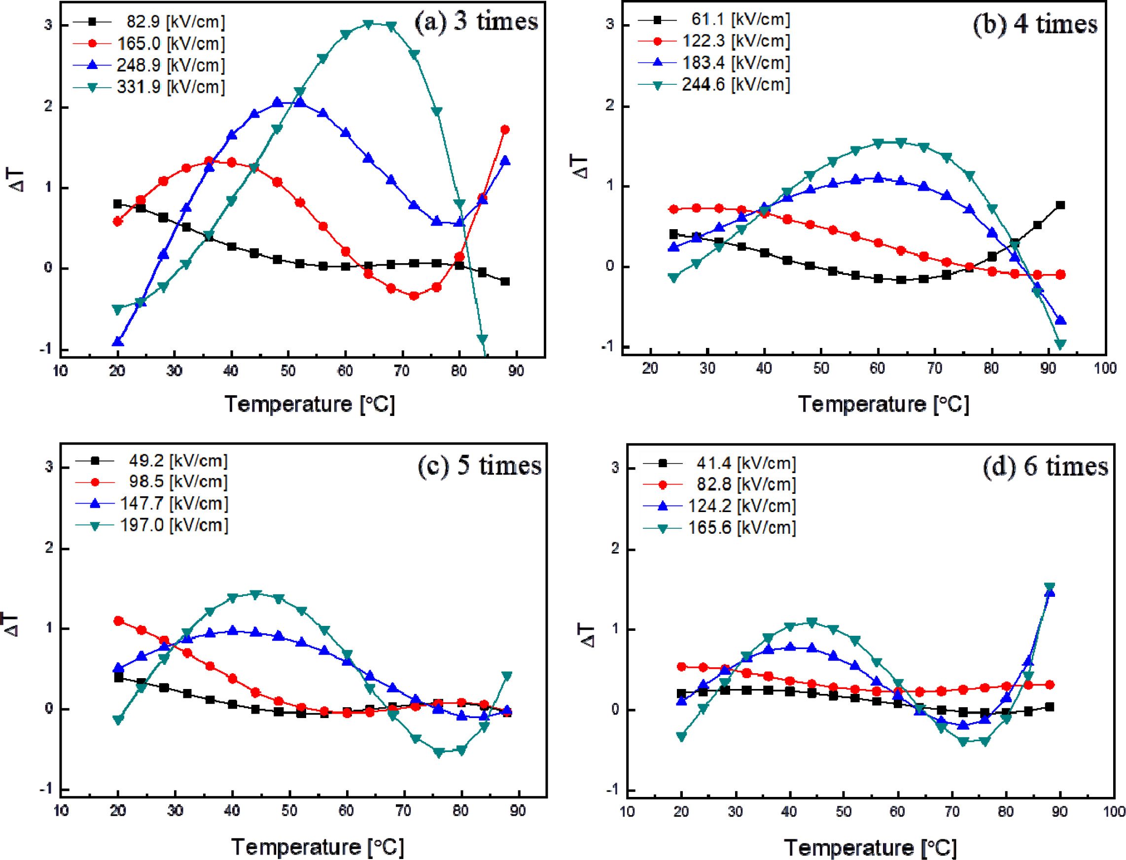 Here, ∆T, C and ρ is temperature change of adiabatic state, specific heat, theoretical density, respectively. At all layers, it was observed that the value of the electrocaloric properties increased as the applied voltage increased, and the it had the hightest value of the electrocaloric properties when the voltage of 331.9 kV/cm was applied at the 3 times coated layers.