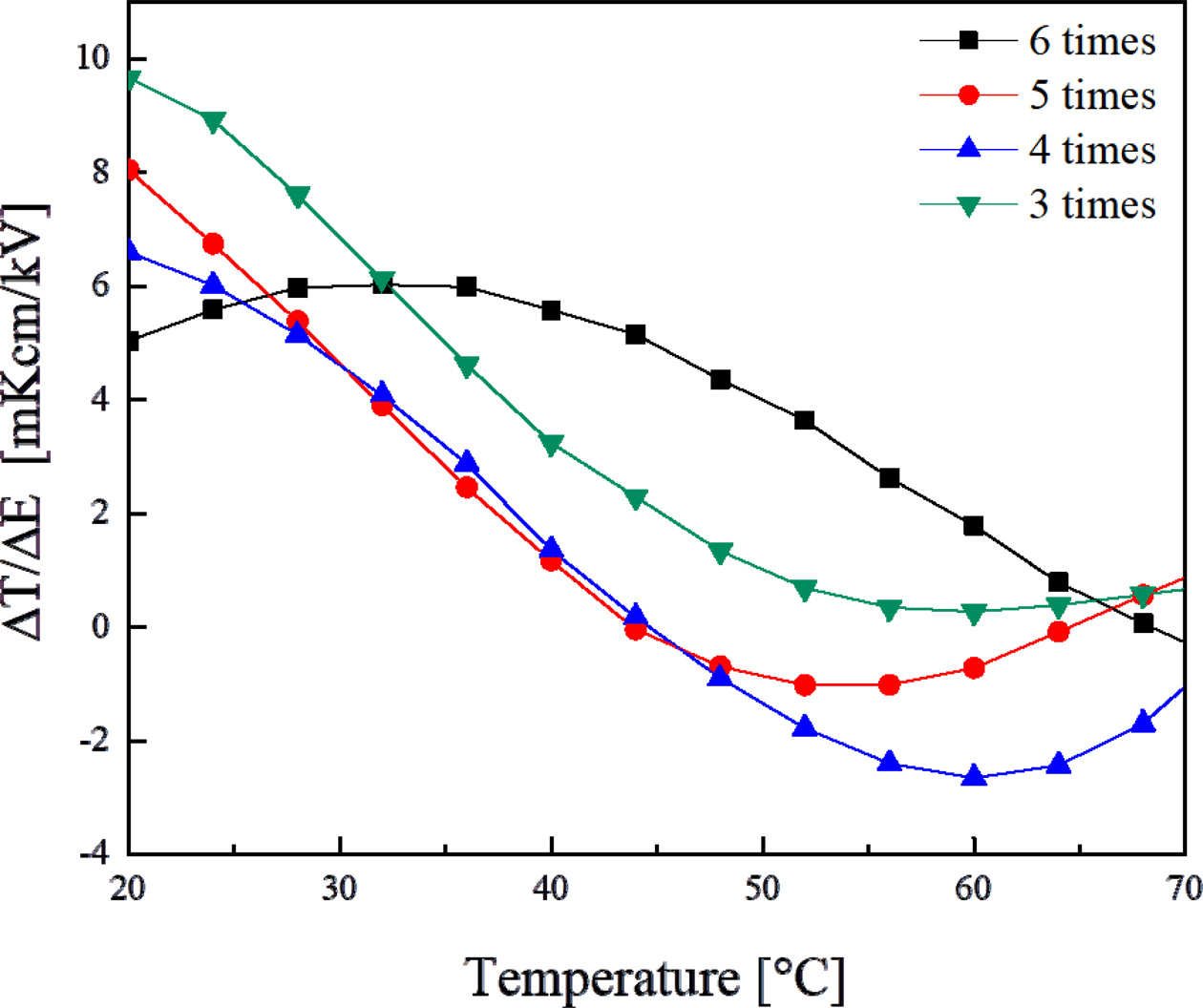 Fig. 8 shows Electrocaloric responsivity estimated at different electric fields according to the Maxwell relation. The maximum responsivity was obtained from six coated KTN thin film at low temperature (-50 oC) and three coated KTN thin film at high temperature (50-70 oC).