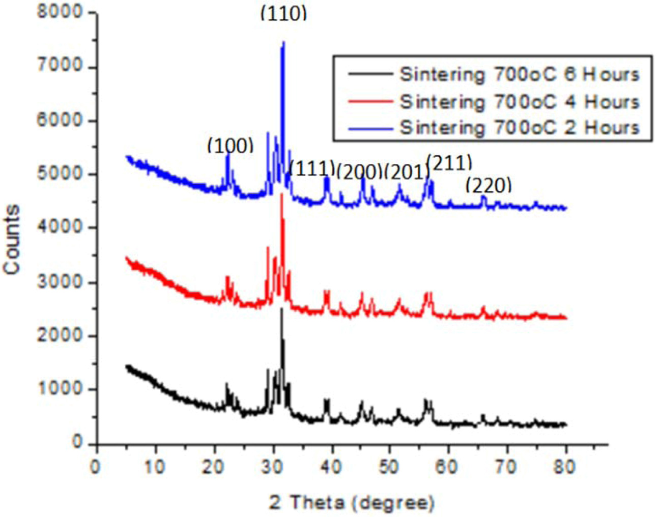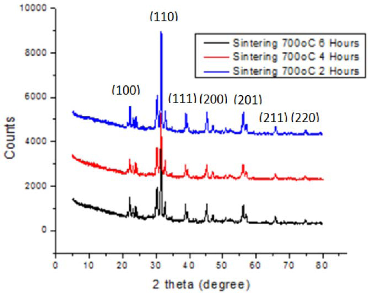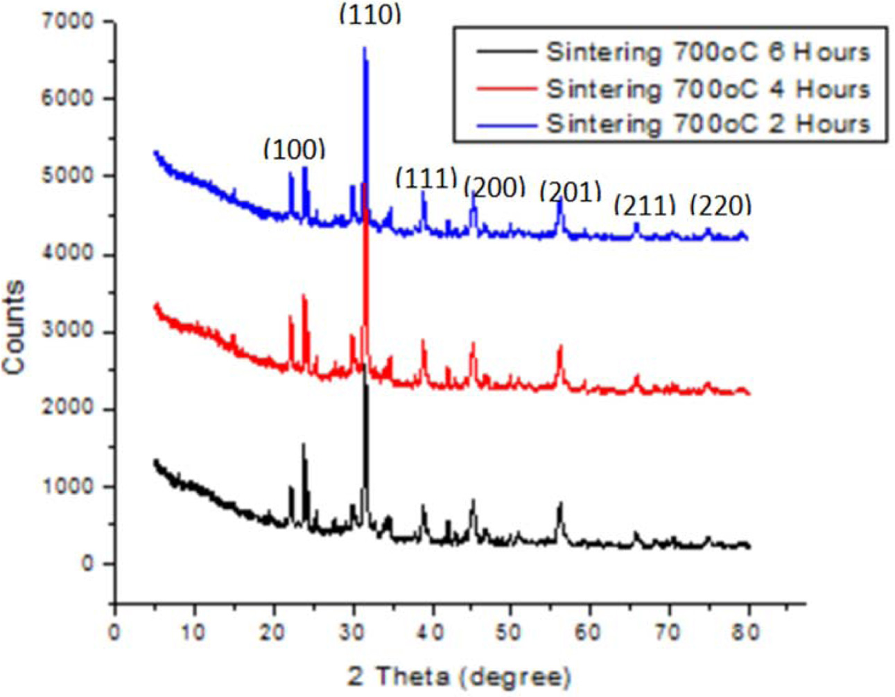 The crushed powder was then sintered at 700 oC for 2, 4, and 6 h, in order to ensure complete crystallization, before a finally crushing.