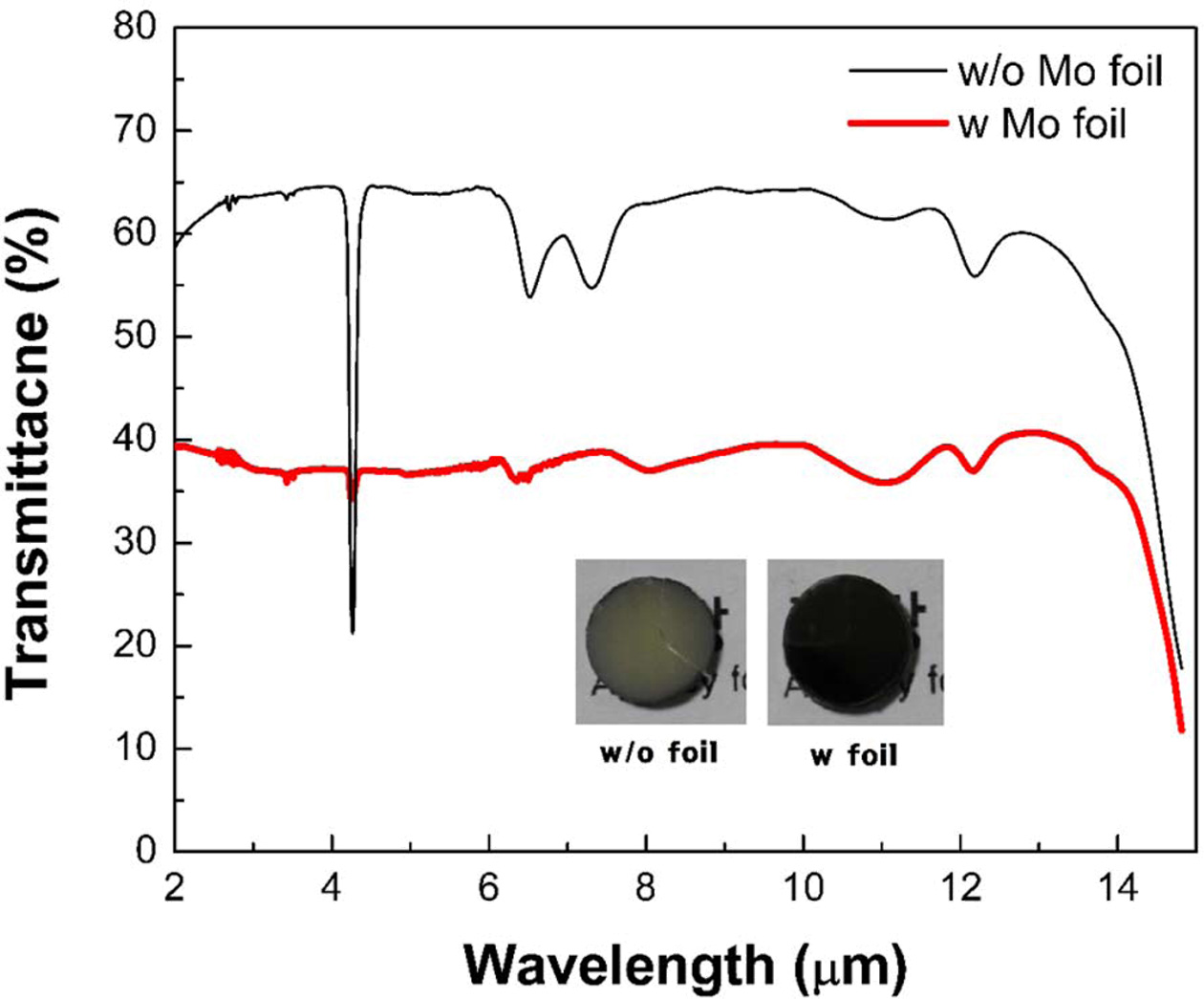 Fig. 2 shows the IR transmittance spectra and photo- graphs of spark plasma sintered ZnS ceramics with and without Mo foil shielding, obtained by FTIR measure- ment over a wavelength range of 2-14 µm. The inset shows photographs of the as-sintered ceramics. The ZnS ceramic fabricated without Mo foil shielding exhibits high transmittance in the IR region with a maximum transmittance of 63% at 8 µm except for a few absorption peaks. The strong absorption peak at 4.2 µm is attributed to CO2 absorption, and the peaks at 6.5 µm and 7.3 µm corresponds C-H absorption [28, 29, 33-35]. These carbon-related absorption features are due to carbon contamination induced by the graphite mold. In contrast, the ZnS ceramic shielded by Mo foil has lower absorption peaks compared to the ZnS ceramics fabricated without Mo foil shielding. This is due to the foil shielding, which successfully suppressed carbon contamination from the mold at high temperatures [25].