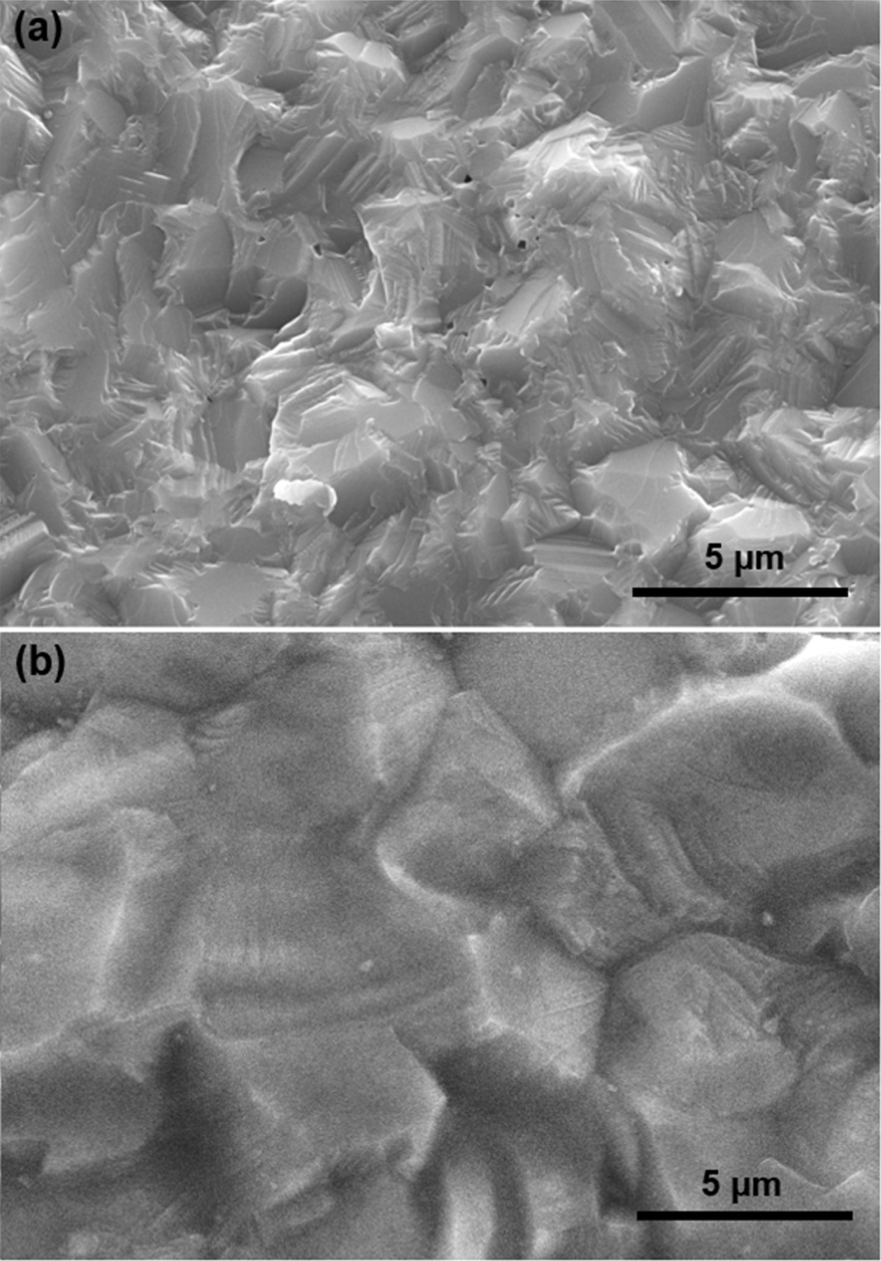 Fig. 4 SEM micrographs showing fractured surface of the ZnS ceramics spark plasma sintered (a) without Mo foil and (b) with Mo foil. |