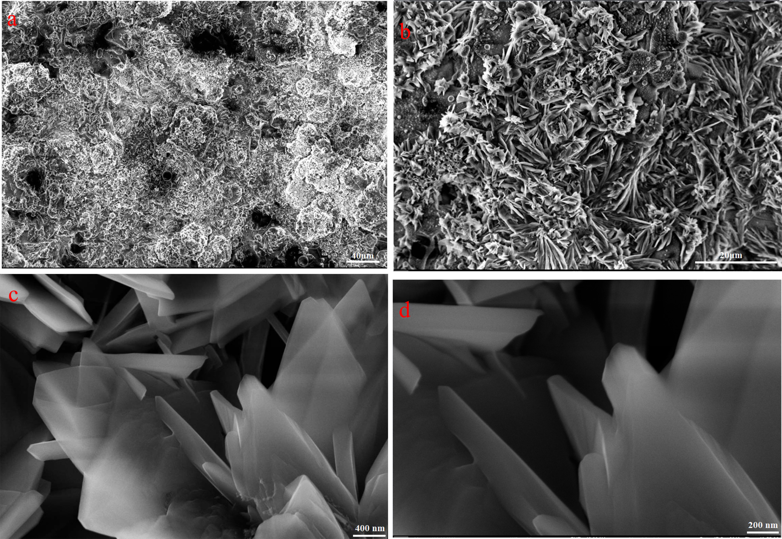 Fig. 4 HA coated microstructure of AZ31 alloy: (a) 500X, (b) 2500X, (c) 50k X, (d) 100k X. |
