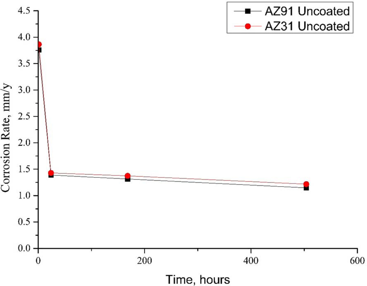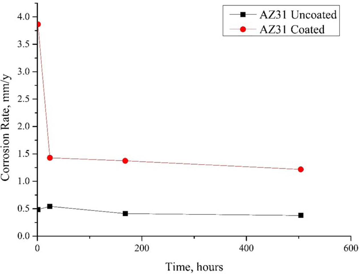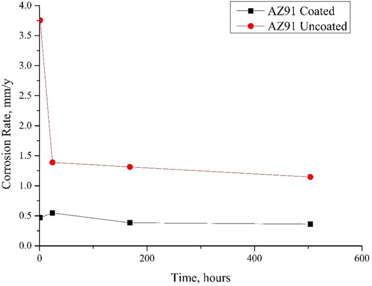 The corrosion rates of the samples were calculated by determining the weight losses in the corrosion experiments and replacing the values obtained here with Eq. (1). Fig. 10 shows the corrosion rate of uncoated AZ31 and AZ91 alloys. Accordingly, the materials showed similar corrosion behavior. The corrosion rate, which increased exponentially in the first 1 h, had a horizontal course after 24 h, 1.21 mm/y for AZ31 and 1.14 mm/y for AZ91 after 504 h.