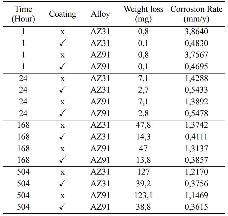 In the first stage of the study, coating experiments were made, and surface morphologies were determined by SEM method. In the second stage, corrosion per- formances were investigated by weight loss method. The weight losses and corrosion rates obtained during the corrosion test are given in Table 5. Corrosion rate for pure magnesium is shown in the literature as approximately 2 mm/y [29]. This rate is determined as 1.2 mm/y for uncoated AZ31 and AZ91 alloys. As a result of HA coating with plasma spray coating, corrosion rate reduced to 0.4 mm/y. In the literature, this ratio has been reduced to 0.3 mm/y to 1 mm/y with coating.