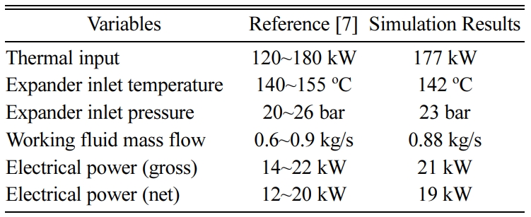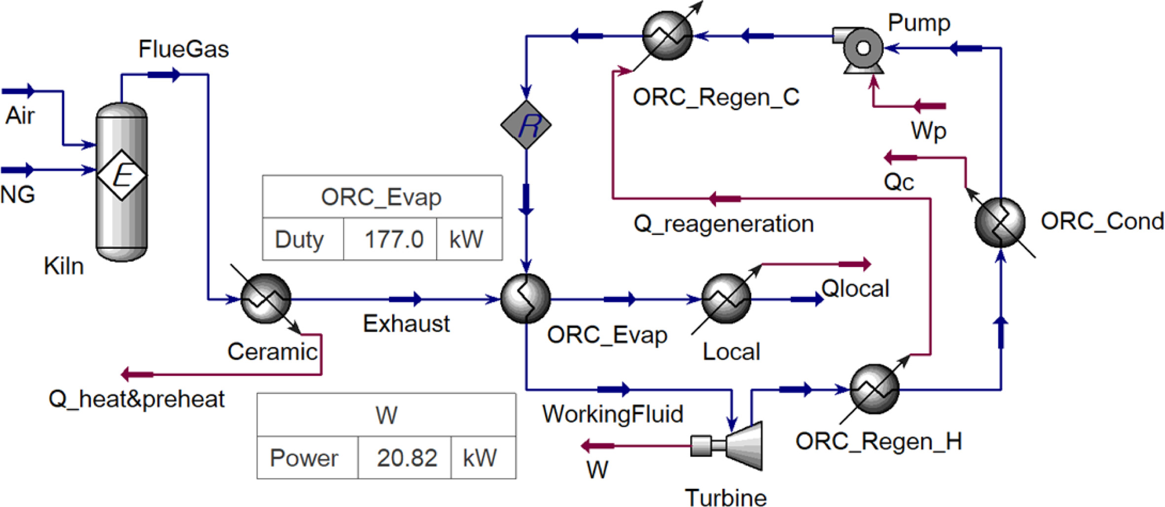. The outlet temperature of exhaust flue gas and the outlet air temperature from ORC evaporator is assumed to 287 oC and 170 oC, the amount of heat utilized in the ORC is 177 kW, based on the Peris et al. [7]. The process modeling of the ORC, subject to the waste heat recovery of exhaust flue gas from the kiln, is validated with the reference [7], which shows a fairly good agreement as shown in Table 2.