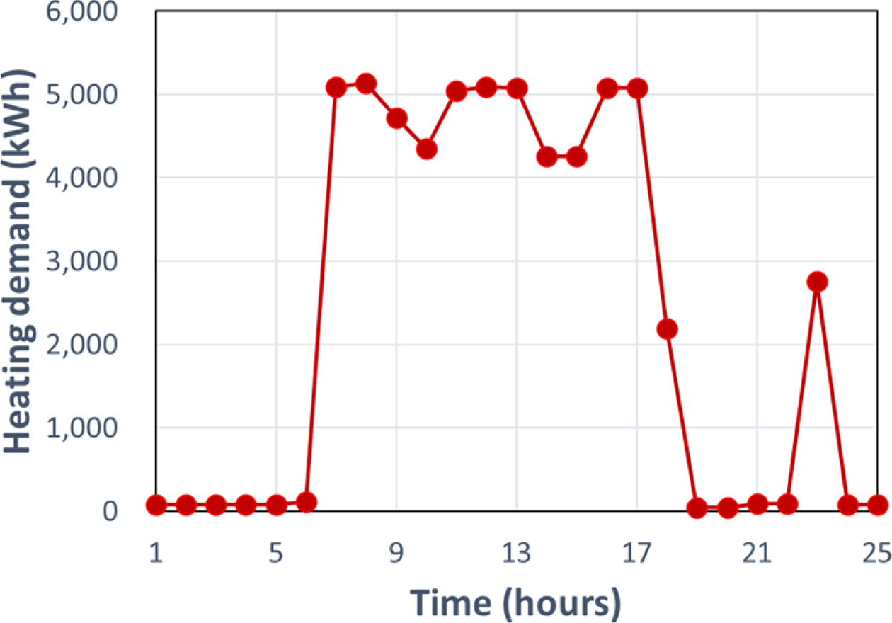 Energy demand for district heating systems can be characterized with changes in daily demand and annual demand. In this study, daily demand selected for the modeling and analysis in this work is based on the demand for industrial buildings in winter when heating is required, and the typical profile of changes in energy demand over time is shown in Fig. 3 [16].