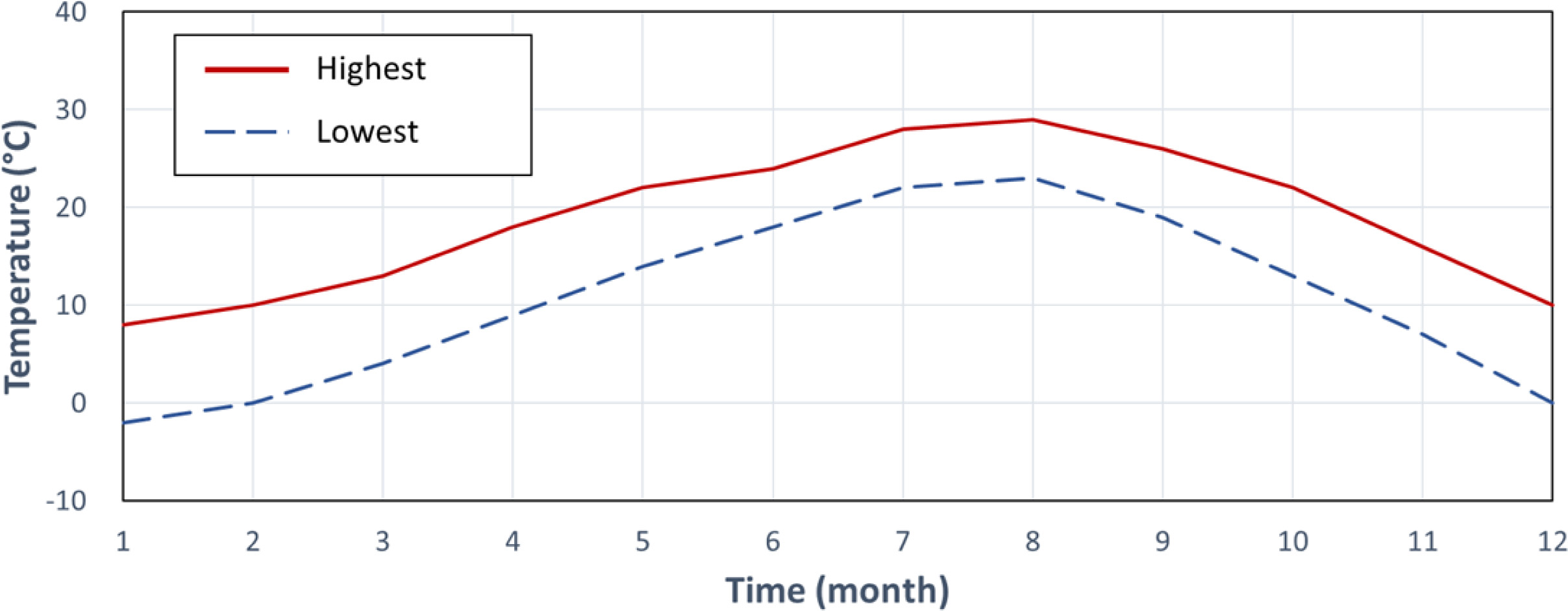 Fig. 5 Typical profiles of the highest and lowest average temperature over a year. |