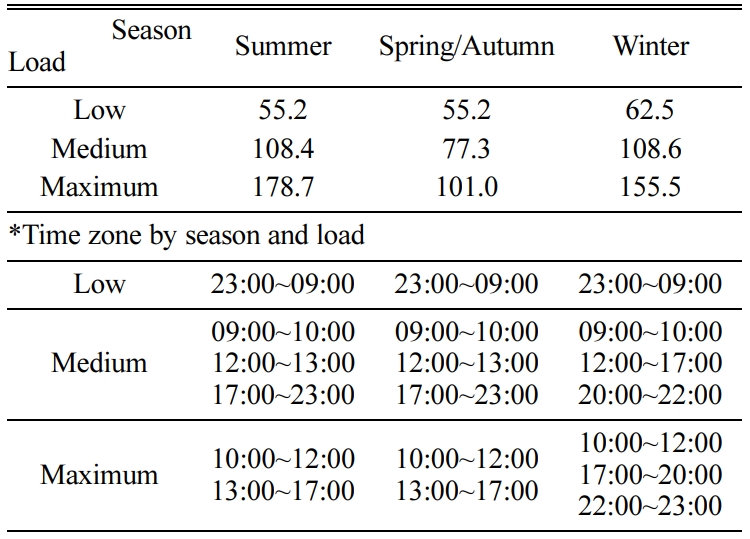When natural gas is used for the district heating of buildings, tariffs for business-purpose city gas is region specific. 18.0 won/MJ is used in our work, which is the charge rate of city gas for business heating in Busan in 2019 [19]. The electricity prices for industrial high-voltage supply are provided in Table 3 [20] in details, which are varied with time of the day and season.