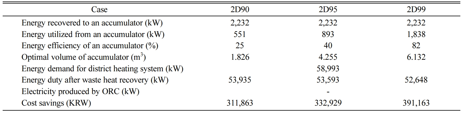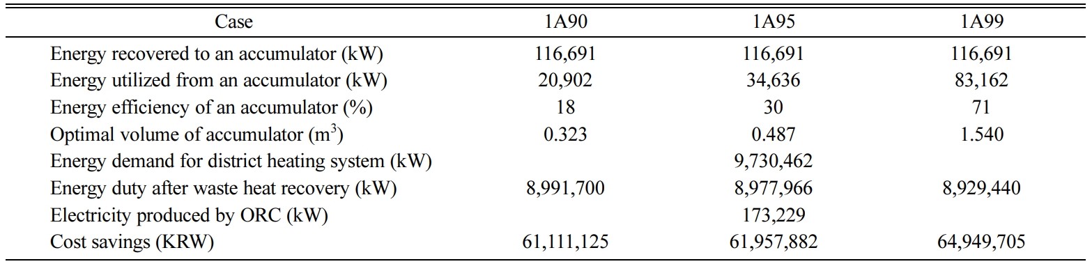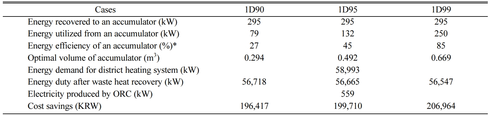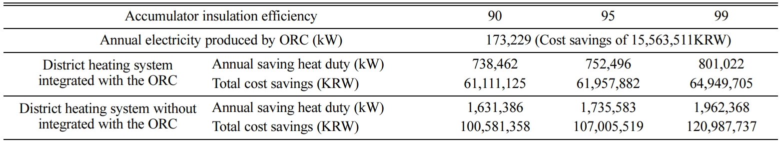 Table 4 shows the results of cases in which both ORC and district heating are integrated with industrial waste heat, subject to daily change in heat demand. As the insulation efficiency of the heat storage increases, the amount of recovered heat from the accumulator increases, which results in reduction in energy loss related to heat recovery in the district heating and, consequently, savings in overall cost.