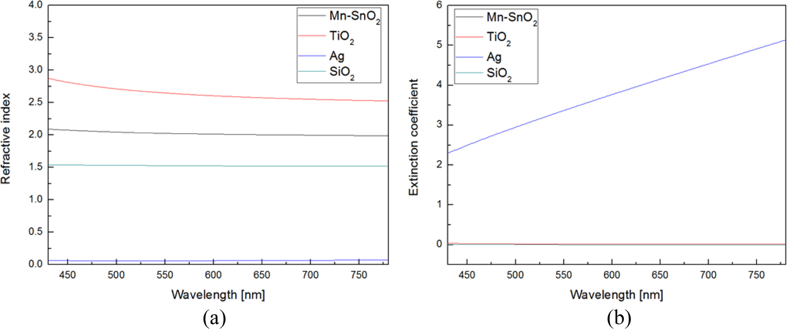 Fig. 2 Measured (a) refractive index and (b) extinction coefficient spectra of MTO, SiO2 and Ag single layer films. |