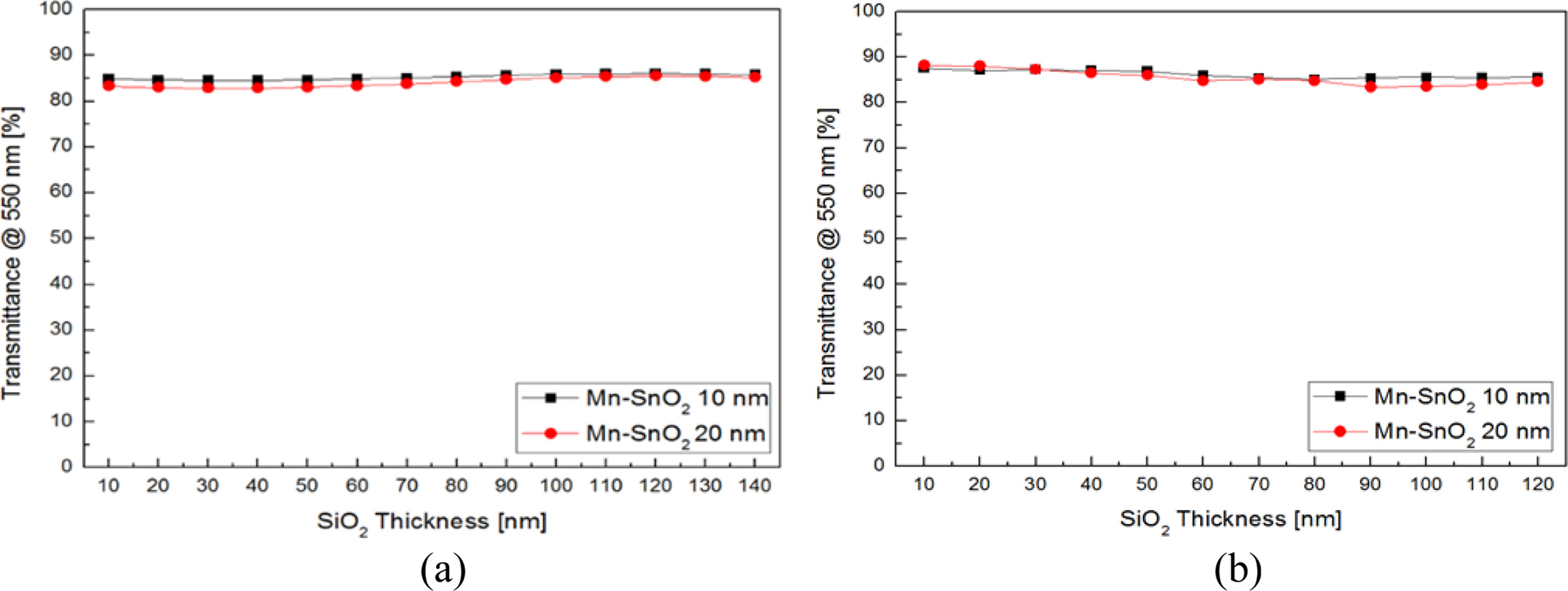 Fig. 3 shows the optical spectra of simulated and experimental transmittance in MTO (40 nm)/Ag (13 nm)/MTO (40 nm)/SiO2 (10-120 nm)/MTO (10-20 nm) film as a function of SiO2 and MTO thicknesses at 550 nm wavelength (Tr550nm). As can be seen from Fig. 3(a), the simulated transmittance has not changed significantly. Only it is seen that the simulated transmittance value was slightly increased with increasing SiO2 thickness. Whereas, the experimental results in Fig. 3(b), Tr550nm of films was gradually decreased from 87.6 to 85.1% in MTO (10 nm) and from 88.2 to 83.4% in MTO (20 nm), with increasing thickness of SiO2 from 10 to 120 nm. The slight deviation of trends between the simulation and the experiment results are presumably associated with the effect of the absorption rise with the increase of SiO2, which is much greater than anti-reflection effect of IMLs [20]. Moreover, deposition temperature was considered to cause crystallinity change and interface instability due to elemental diffusion between the layers of the stackup. In addition, when the MTO thickness in IML was 20 nm, transmittance decline was much higher than MTO (10 nm) specimens at various SiO2 thickness range of 80-120 nm.