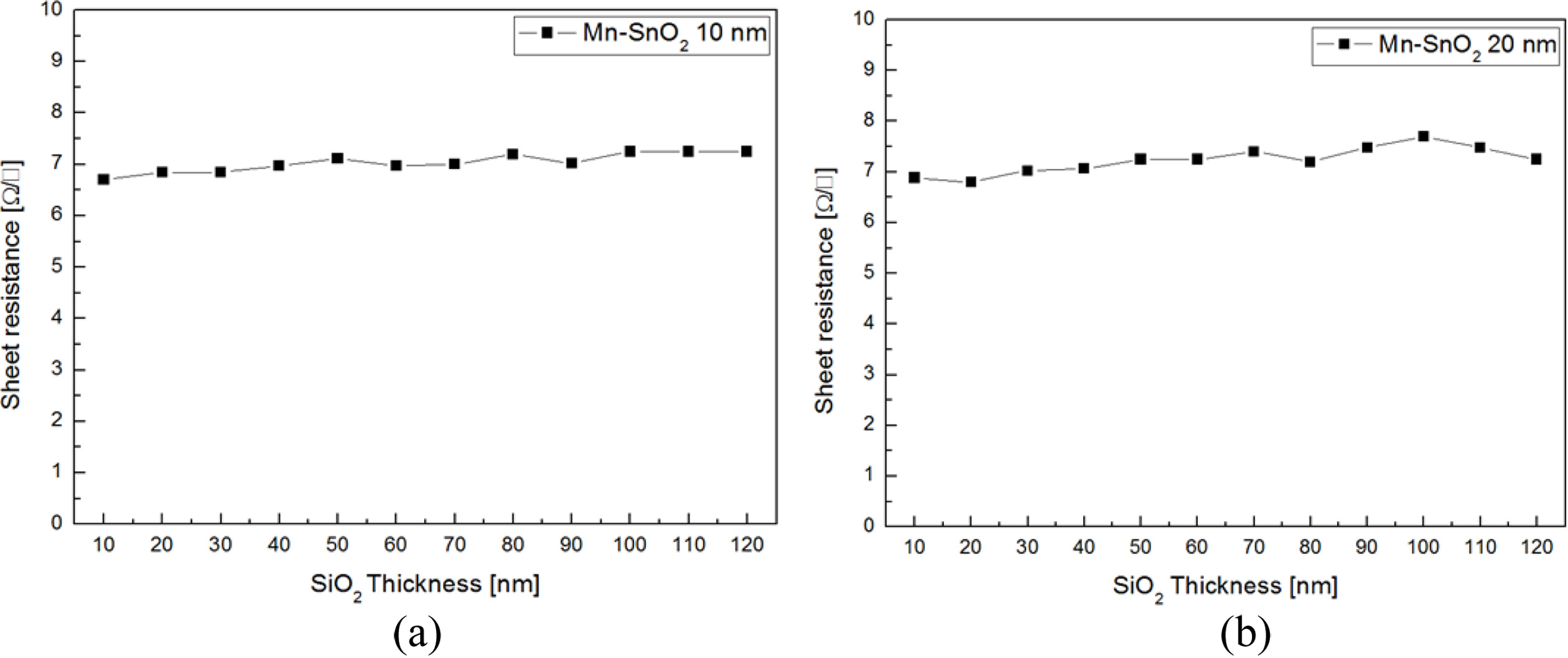 Fig. 5 The sheet resistances (Rsh) of MTO (40 nm)/Ag (13 nm)/MTO (40 nm)/SiO2 (10-120 nm)/MTO (10-20 nm) multilayer films depending on SiO2 and MTO thickness; (a) MTO (10 nm) and (b) MTO (20 nm). |
