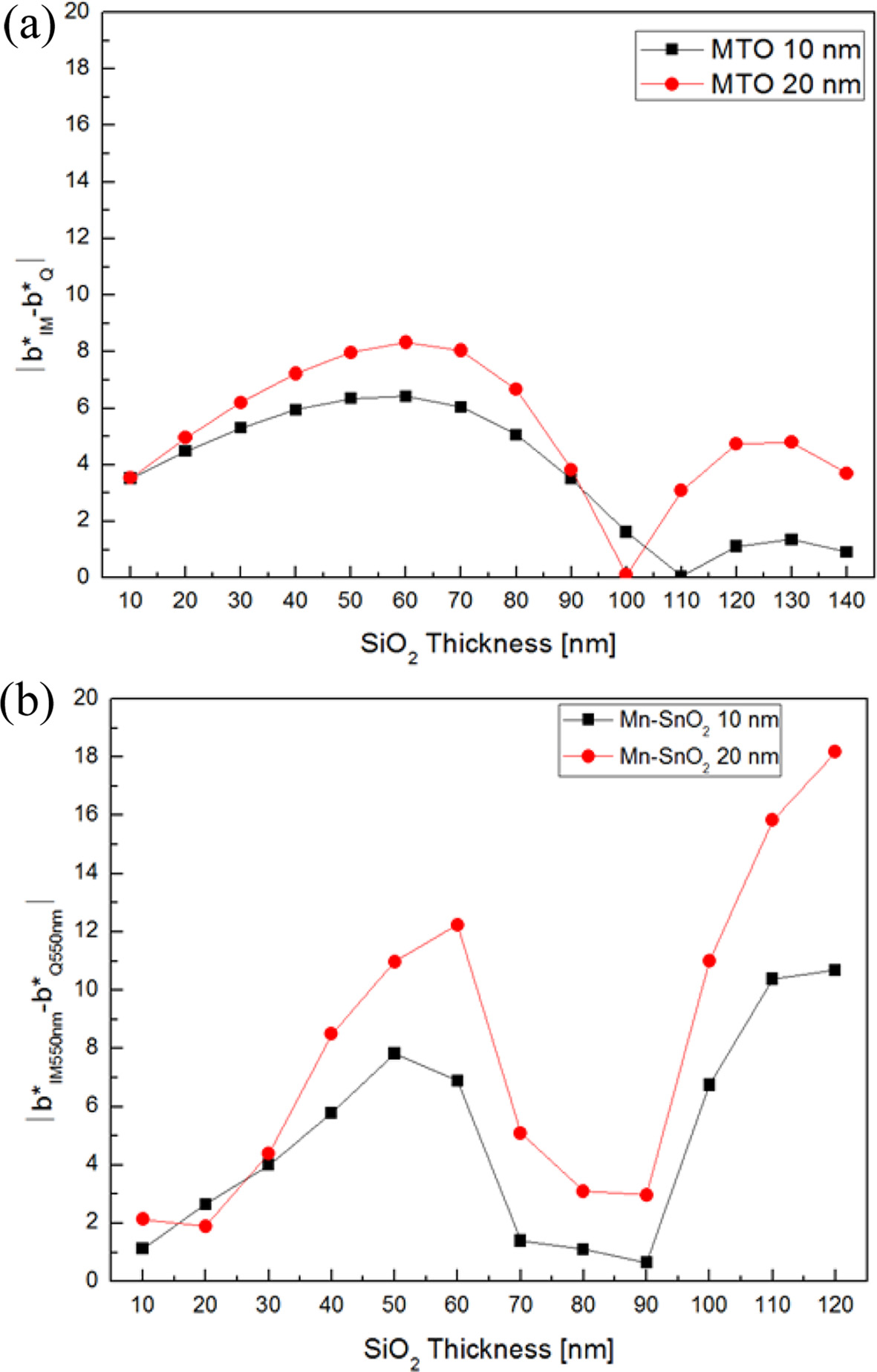 The reflectivity variation can be represented in the CIE L*a*b* color space [22]. The L*a*b* color space describes color appearance by dividing it into three coordinates, L* for lightness and a* and b* for the green-red and blue-yellow, respectively. The yellow/blue colors are represented along the b* axis, with blue at negative b* values and yellow at positive b* values, respectively. Fig. 6 shows the yellow-blue color difference (∆b*) between the etched and the unetched part with different SiO2 thickness. From Fig. 6(a), ∆b* curves shows the similar modulated patterns as compared with the reflectivity spectra. The lowest ∆b* was as low as 0.06 at SiO2 (60 nm)/MTO (10 nm), which is comparable to 3.5 of MTO/Ag/MTO/PET film without IMLs. Table 1 summarized all the optical and pattern visibility properties of MTO (40 nm)/Ag (13 nm)/MTO (40 nm) films depending on the IMLs thickness.