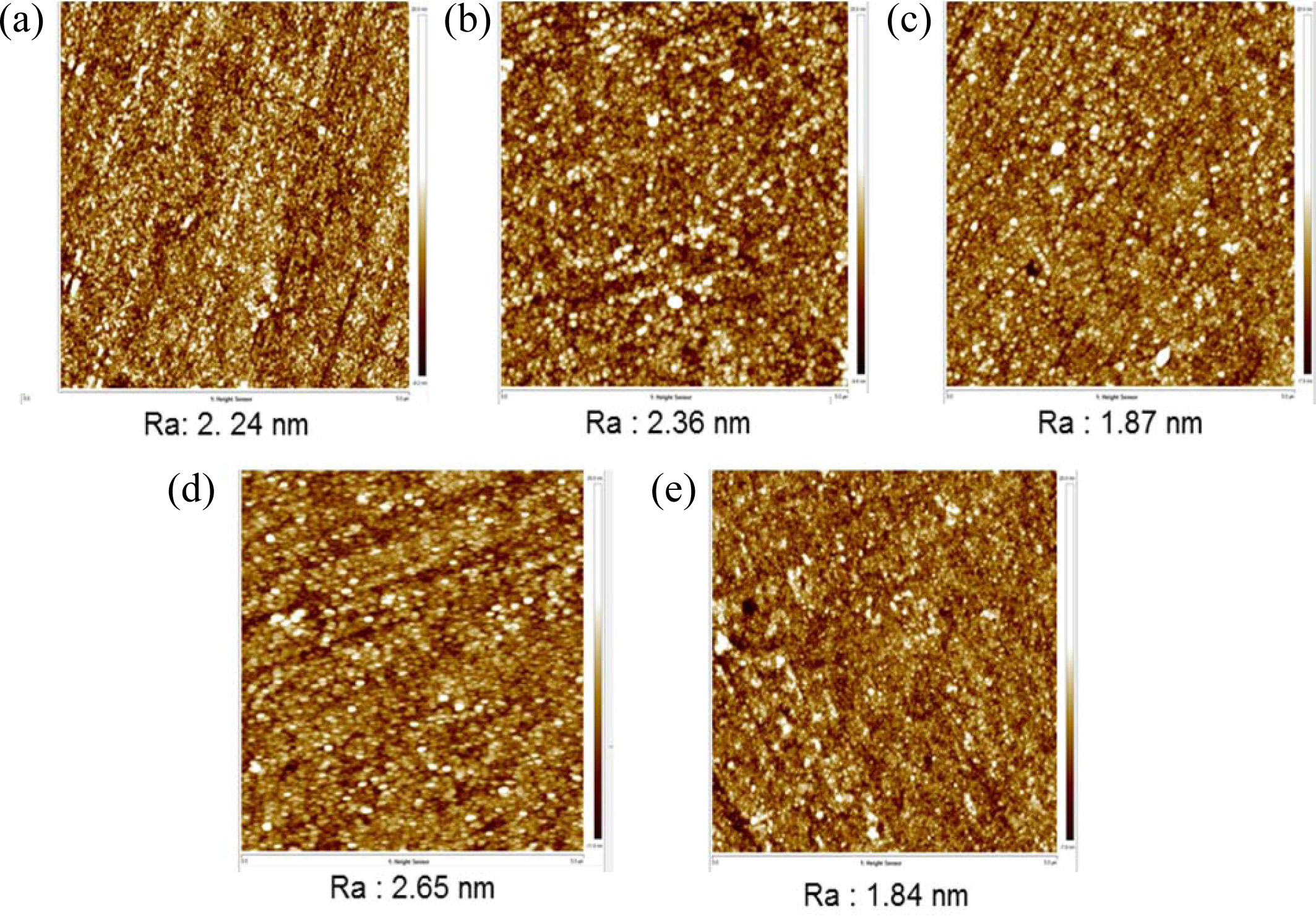 Fig. 7 The surface roughness of MTO (40 nm)/Ag (13 nm)/MTO (40 nm) film with SiO2 (90 nm)/MTO (10 nm) layer with deposition order; (a) MTO (10 nm), (b) SiO2 (90 nm)/MTO (10 nm), (c) MTO (40 nm)/SiO2 (90 nm)/MTO (10 nm), (d) Ag (13 nm)/MTO (40 nm)/SiO2 (90 nm)/MTO (10 nm) and (e) MTO (40 nm)/Ag (13 nm)/MTO (40 nm)/SiO2 (90 nm)/MTO (10 nm). |