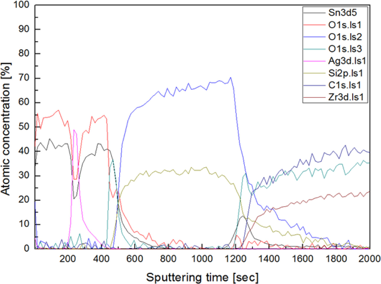 Fig. 8 XPS depth profile of MTO (40 nm)/Ag (13 nm)/MTO (40 nm) film with SiO2 (90 nm)/MTO (10 nm) layer. |