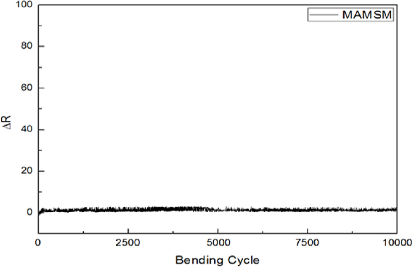 Fig. 9 represents the bending cycle-resistance change (∆R) curve of MTO (40 nm)/Ag (13 nm)/MTO (40 nm) film with SiO2 (90 nm)/MTO (10 nm) layer. The resistance change can be estimated as R-R0, where R0 is the initial resistance and R is the final resistance during the bending test. The value of ∆R for the optimized film remains almost constant after 10,000 cycles. The film resistance was varied from 14.2 to 15.6 Ω, increased approximately 10%. This result implies that the MTO/Ag/MTO/SiO2/MTO multilayer film has the excellent flexibility under the condition of 5 mm inner bending radius.