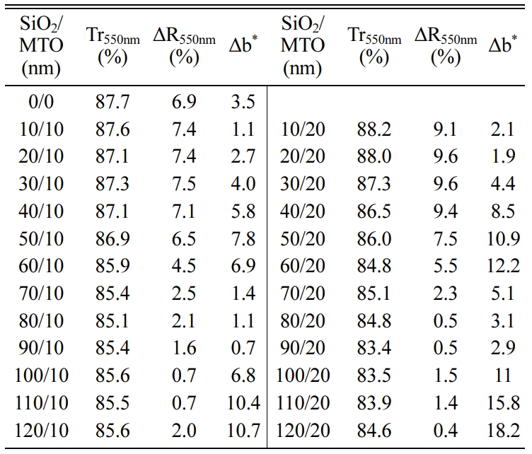 Fig. 5. shows the sheet resistances (Rsh) of MTO (40 nm)/Ag (13 nm)/MTO (40 nm)/SiO2 (10-120 nm)/MTO (10-20 nm) multilayer films depending on SiO2 and MTO thickness. As seen in Fig. 5, sheet resistance remained almost constant, ranging from 6 to 8 Ω/sq., regardless of the SiO2 film thickness change (10-120 nm), although MTO thickness are varied from 10 to 20 nm. Generally, the total sheet resistance of stacked OMO multilayer film is subjected to the dominant effect on the thin embedded Ag layer [21]. Therefore, the resistance was maintained as a result of fixing the thickness of Ag layer (13 nm).