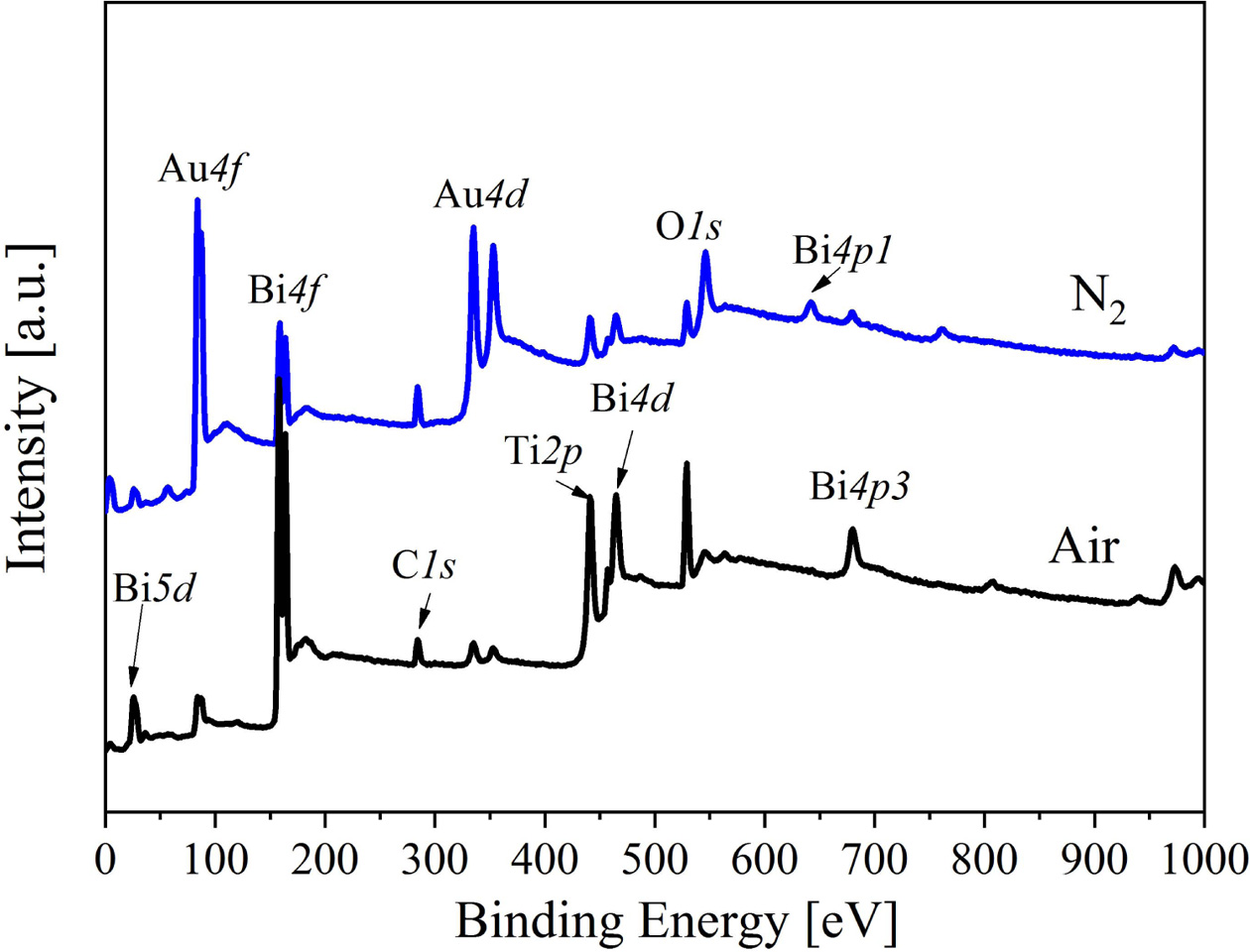 For understanding the element valence state and defect state of the BIT films annealed in different atmospheres, XPS test and analysis are accomplished on the sample surfaces. The XPS wide sweep spectrum of the two samples as shown in Fig. 1. Except for C1s, Au4f and Au4d orbital peaks are also detected due to the Au top electrode sputtered on the surface of the BIT films.