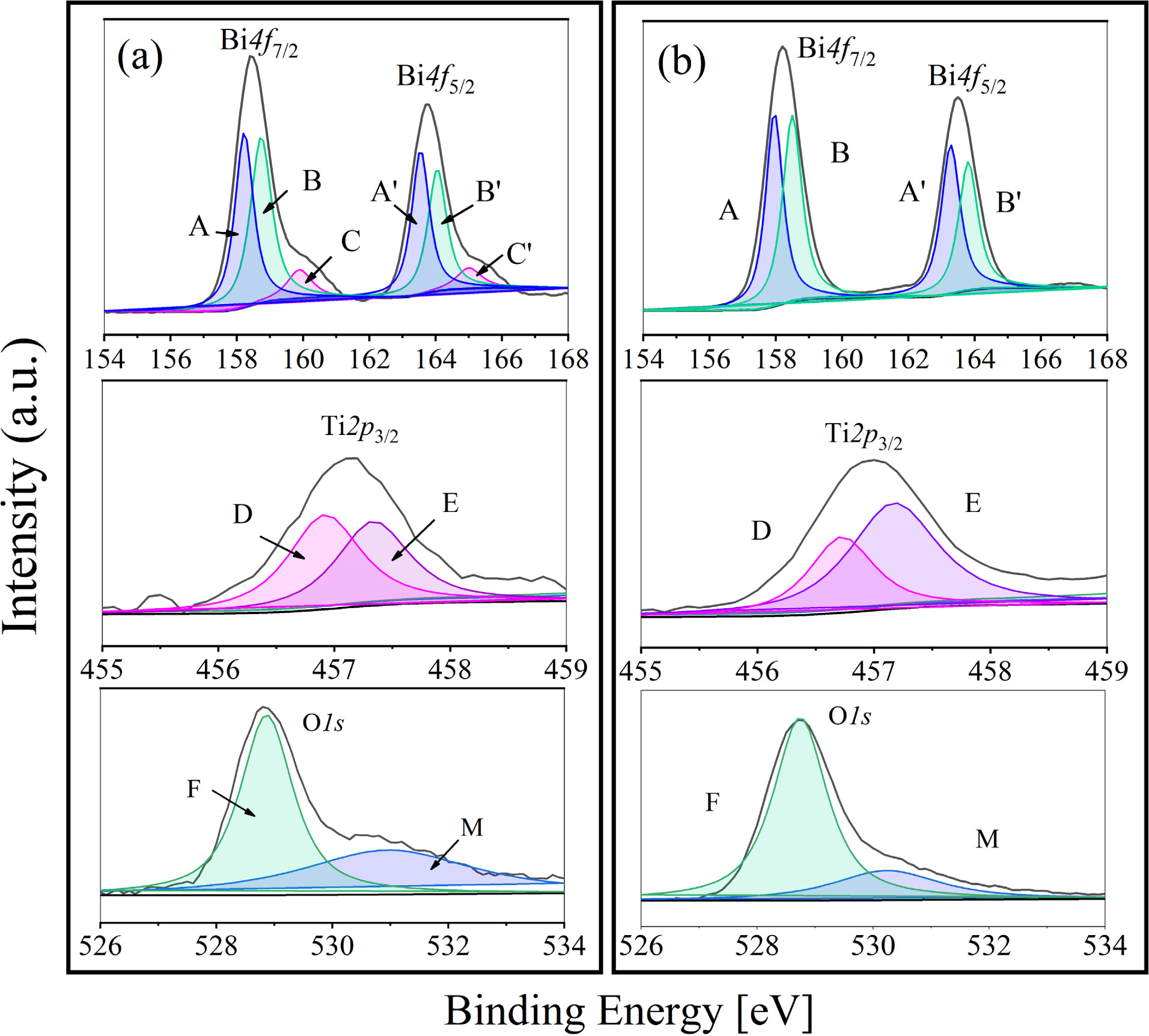 In addition, the Lorentz-gauss formula is applied in fitting the XPS peaks of Bi4f, Ti2p3/2 and O1s respectively. Because of the superposition of partial peaks of Ti2p1/2 and Bi4d3/2, Ti2p3/2 is chosen instead of Ti2p to be fitted. And the two kind of BIT film samples show significant differences in the peak seg- mentation in Fig. 2. In Fig. 2(a), the main peak position of Bi4f7/2 (158.5 eV) and Bi4f5/2 (163.8 eV) in the samples annealed in nitrogen is typical Bi4f spin orbit dipole splitting energy based on the formula D(Bi4f5/2 - Bi4f7/2) = 5.3 eV. The peak group including A (158.2 eV) and A' (163.5 eV) is the result of the production of bismuth suboxide [18], besides the peak group of B (158.5 eV) and B' (163.8 eV) could be regarded as the main contribution of Bi3+ cation in the lattice [19]. There is also a group of spin orbit dipole C (159.9 eV) and C' (165 eV), which can be classified as Bi metal (Bi0) according to the literature [17]. The reason for the occurrence of Bi0 is inferred as the exposure to reduction atmosphere during the annealing process. Accordingly, as shown in Fig. 2(b), there is no peak group of C and C' in the Bi4f orbital fitting peaks of the air-annealed film sample. In addition, the shift of Ti2p3/2 peak to low binding energy reveals the transition of Ti from Ti4+ to Ti3+ [20]. The component peak D represents Ti3+, while the component peak E represents Ti4+. According to the fitting results, Ti3+:Ti4+ area ratio of the nitrogen and air-annealed films is 1:0.89 and 1:1.88, respectively, indicating that the samples annealed in nitrogen contained more Ti3+. Based on the XPS information of O1s orbital, the component peak F around 528.8 eV corresponds to lattice oxygen, besides the component peak M with higher binding energy corresponds to oxygen vacancy or adsorption oxygen [21]. Similarly, the proportion of the lattice oxygen in two samples can be obtained by calculating the fitting area. The proportion of the lattice oxygen in the nitrogen annealing sample is 57%, while that in the air annealing sample is 76%. It indicates that more VO•• are produced in the nitrogen annealed sample.