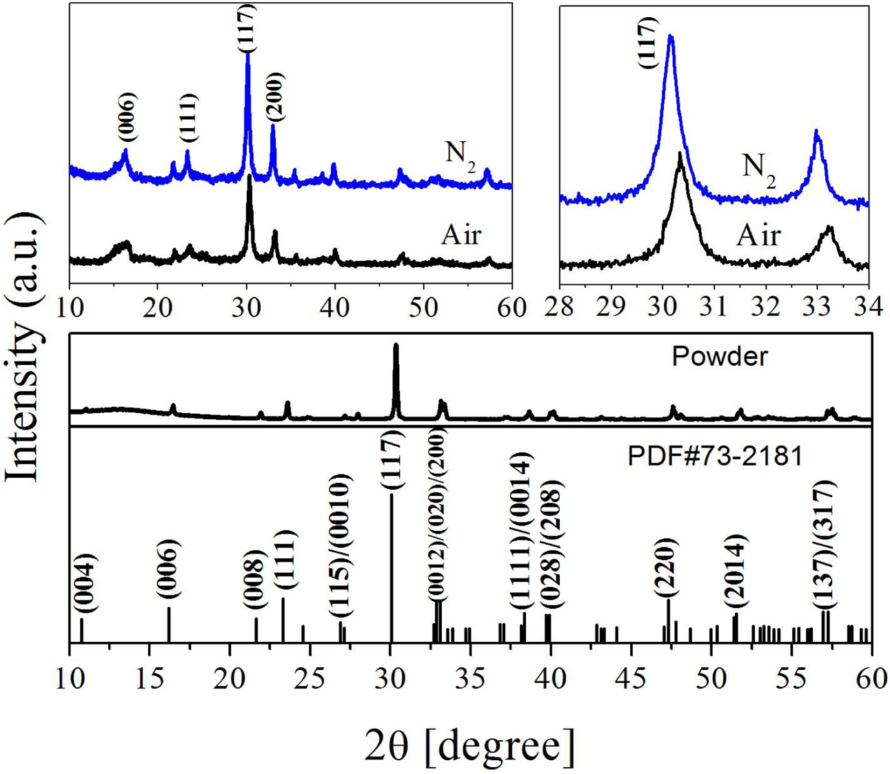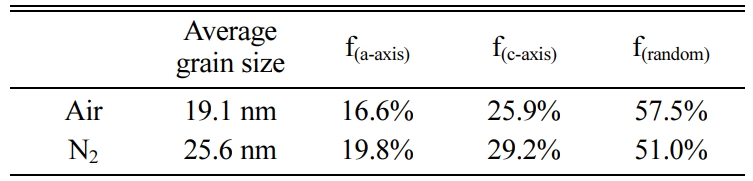 Where Ihkl is the tested intensity of the diffraction peak (hkl) of the film sample and I*hkl is the corres- ponding peak (hkl) strength of the Bi4Ti3O12 powder. The calculated results are listed in Table 1. The grains of a-axis and c-axis orientation are lesser in the sample whether it is prepared in air or nitrogen, indicating that the films are dominated by random orientation [25]. It indicates that there is a little influence of the annealing atmospheres on the grain orientation of the prepared BIT films. The average grain size of the BIT films are obtained via using the Scherrer formula. The average grain size of the air-annealed samples is about 19.1nm, and that of the nitrogen-annealed samples is about 25.6nm. Obviously, the samples annealed in nitrogen show better grain development and larger grain size. As the magnification of 2θ from 28o to 34o, the XRD pattern of the air-annealed samples shows obvious displacement in the direction of large angle. It may be due to the more generation of V''Bi, the decrease of the number of atoms in the crystal and the coulomb force between atoms, resulting in a decrease of cell volume [26, 27].