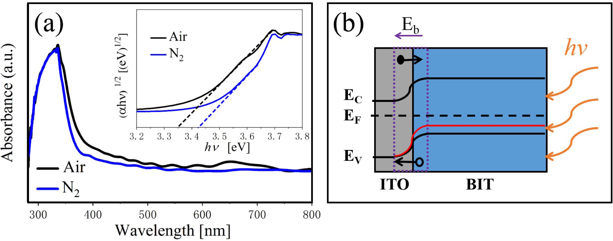 Where, α is a constant, h is the Planck constant, A is the absorption coefficient near the absorption edge, Eg is the absorption band gap energy, and for BIT with indirect band gap, n = 4 [30]. The inset diagram shows (ahv)1/2 vs.(hv)relationship near the absorption edge of the films, and the bandgap values are given by the epitaxy of the linear regions. The band gap value of the air and nitrogen annealed samples are 3.35 eV and 3.47 eV, respectively. It can be seen that the air-annealed samples possess better light absorption capacity compared with the nitrogen-annealed samples. The possible reasons are as follows: (1) The smaller grain size [31, 32]. More reaction and light absorption site are provided by the larger specific surface area of the air-annealed samples, which will increase the effective area of light absorption, thus promoting the transition of photoexcited carriers. (2) The smaller concentration of the oxygen vacancies [33]. The oxygen vacancies are considered to be the main cause of trapping and composite the charge carriers, which can lead to the degradation of the photovoltaic performance of the ferroelectric materials with bandgap engineering. (3) The larger concentration of the bismuth vacancies on the surface [16]. The higher concentration of V''Bi on the surface of the air-annealed samples could adjust the electronic structure greatly and establish a new defect energy level in the forbidden zone. The possible energy band diagram of the BIT films annealed in different atmospheres in the test process of UV-VIS diffuse reflectance are shown in Fig. 5(b). Bi4Ti3O12 are considered to be a p-type semiconductor with a work function greater than 6.1 eV [34]. The holes have an advantage over oxygen ions in conducting electricity at room temperature [35]. Since the work function of ITO substrate (4.85 eV) is smaller than that of BIT, there will be a downward band bend and a schottky barrier field Eb in the depletion area of ITO/BIT interface, thus promoting the separation of photoexcited electron-hole pairs and generating photocurrent [36]. The defect energy level (red line in the figure) established in the forbidden band due to more V''Bi in the air-annealed samples is beneficial to the transition of electrons towards the conduction band under irradiation, which makes the carrier concentration and electron conductivity higher. And the electric field Eb increases, thereby facilitating charge separation.